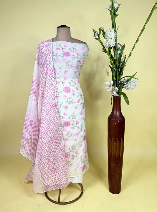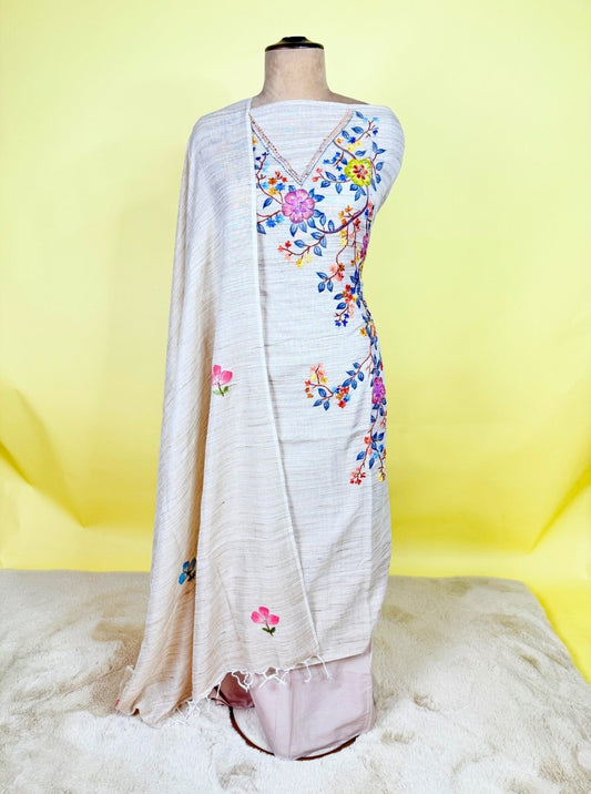 HANDLOOM COTTON SUIT WITH NECKLINE HANDPRINT KATHA WORK & COTTON PANT OR DUPATTA WITH KATHA WORK (SUIT1042)