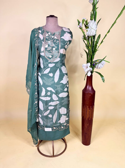 GREEN MUSLIN SUIT WITH DIGITAL PRINTING EMBROIDERE WORK ON NECK ORGANZA DUPATTA WITH ZARI WORK SANTOON BOTTOM (SUIT1012)