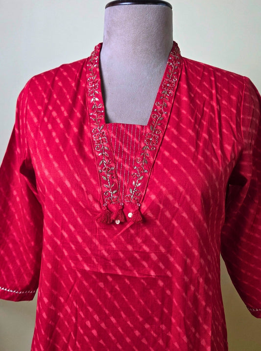 COTTON LEHRIYA KURTI PANT & DUPATTA SET WITH NECK WORK (KUR1070)