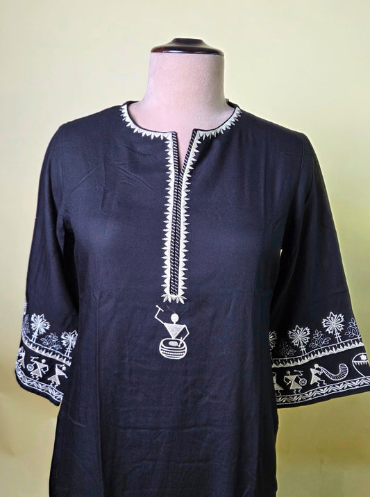 BLACK A LINE KURTI PANT SET WARLI PRINT DUPPATA WITH NECK EMBROIDERY SLEEVES WORK (KUR1072)