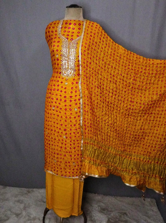 Sold outSATIN GARCHOLA BANDHEJ SUIT