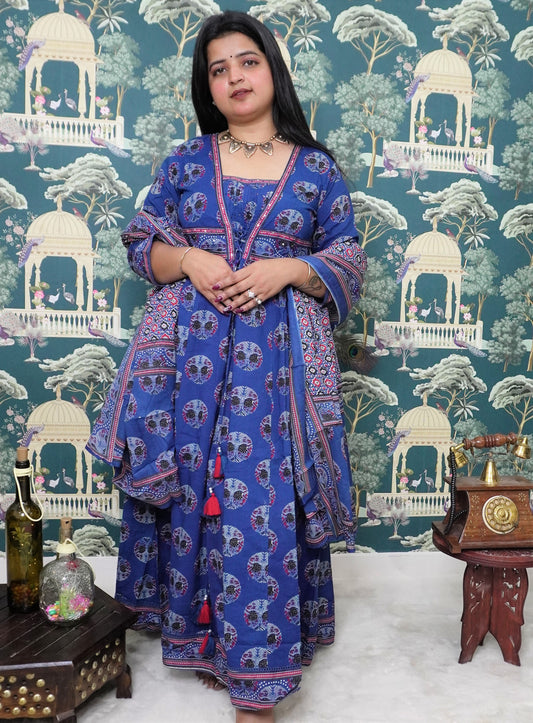 AZRAK PRINT KATHEWADI MIRROR WORK COTTON ANARKALI SUIT (SM1019)