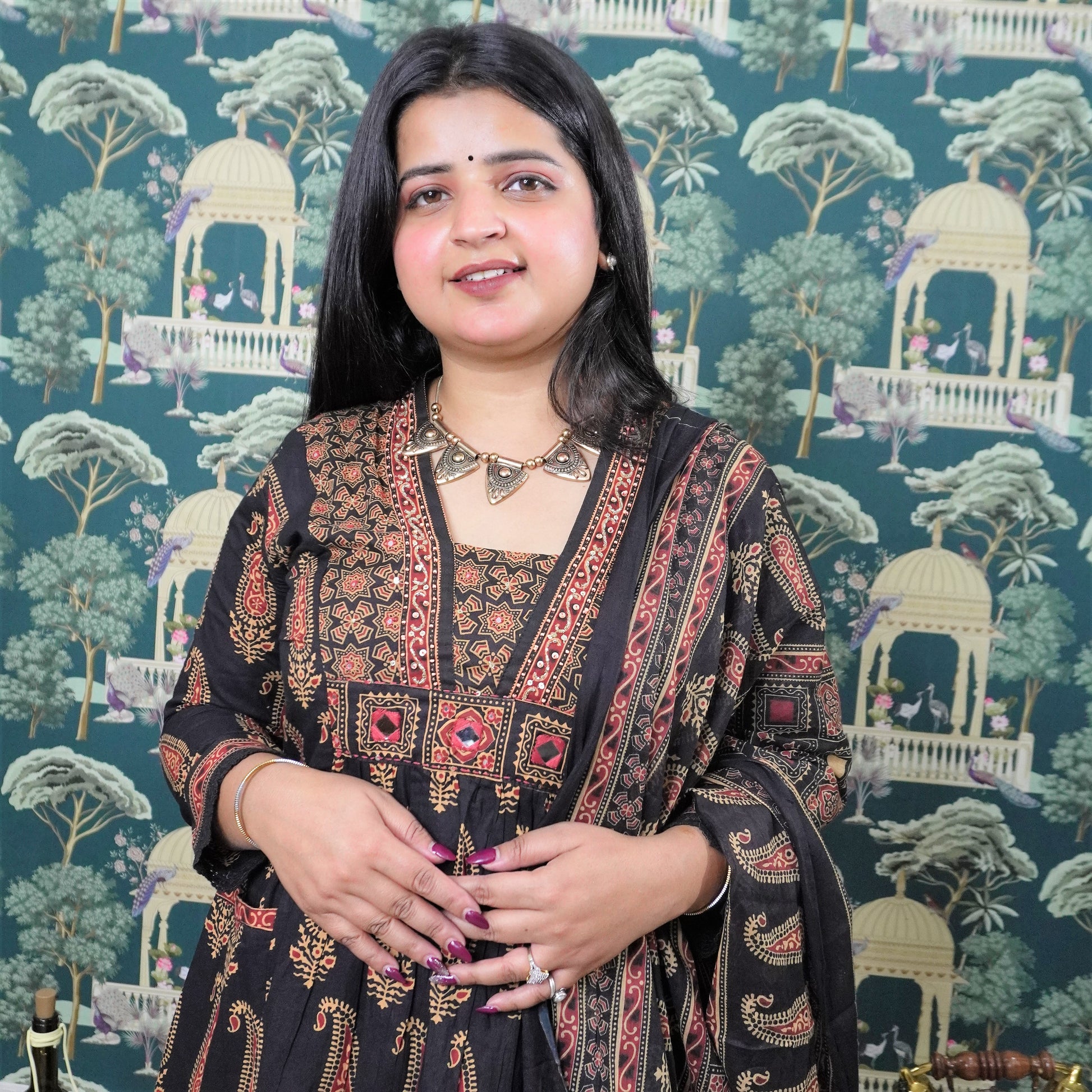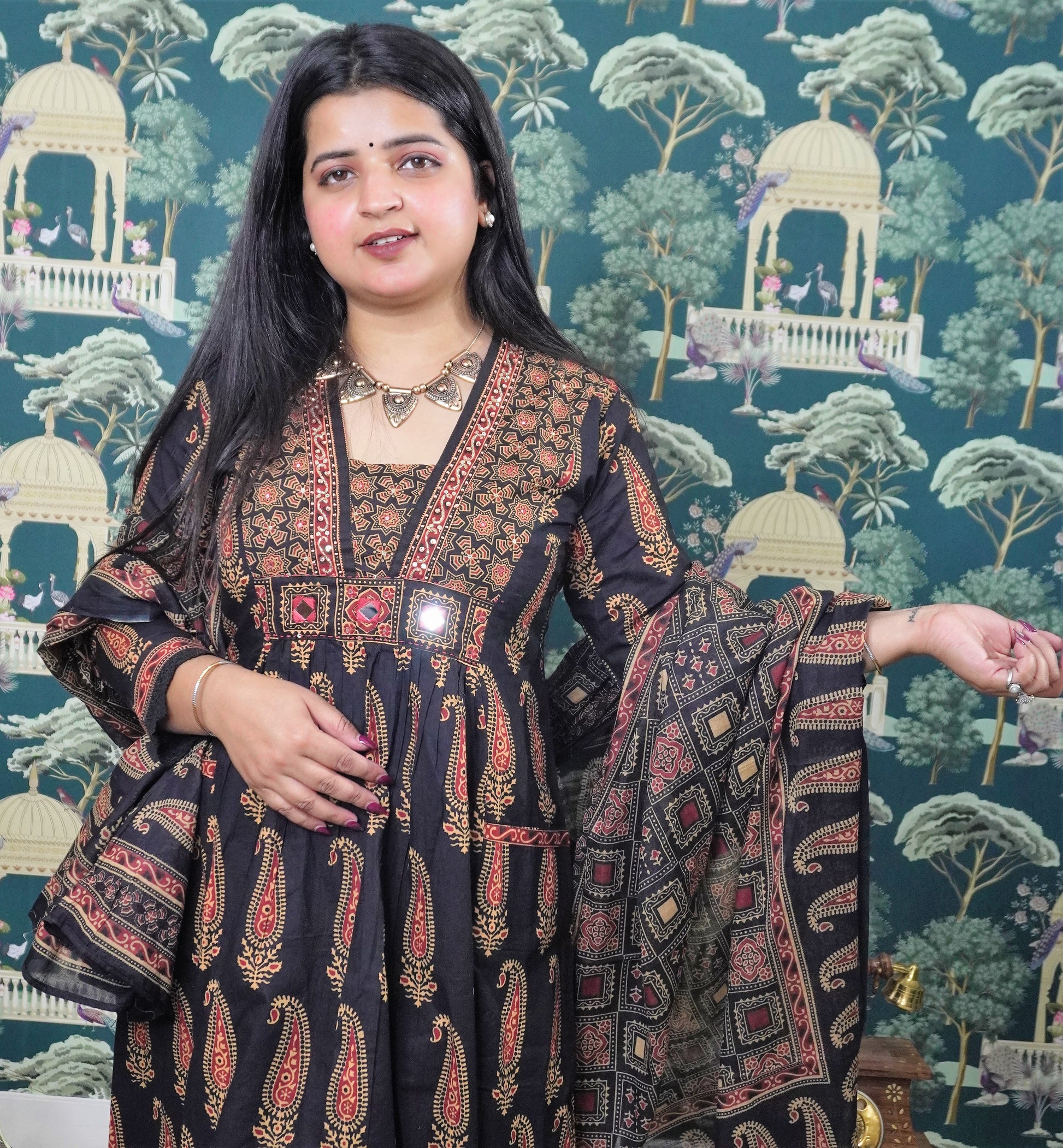AZRAK PRINT KATHEWADI MIRROR WORK COTTON ANARKALI SUIT (SM1019)