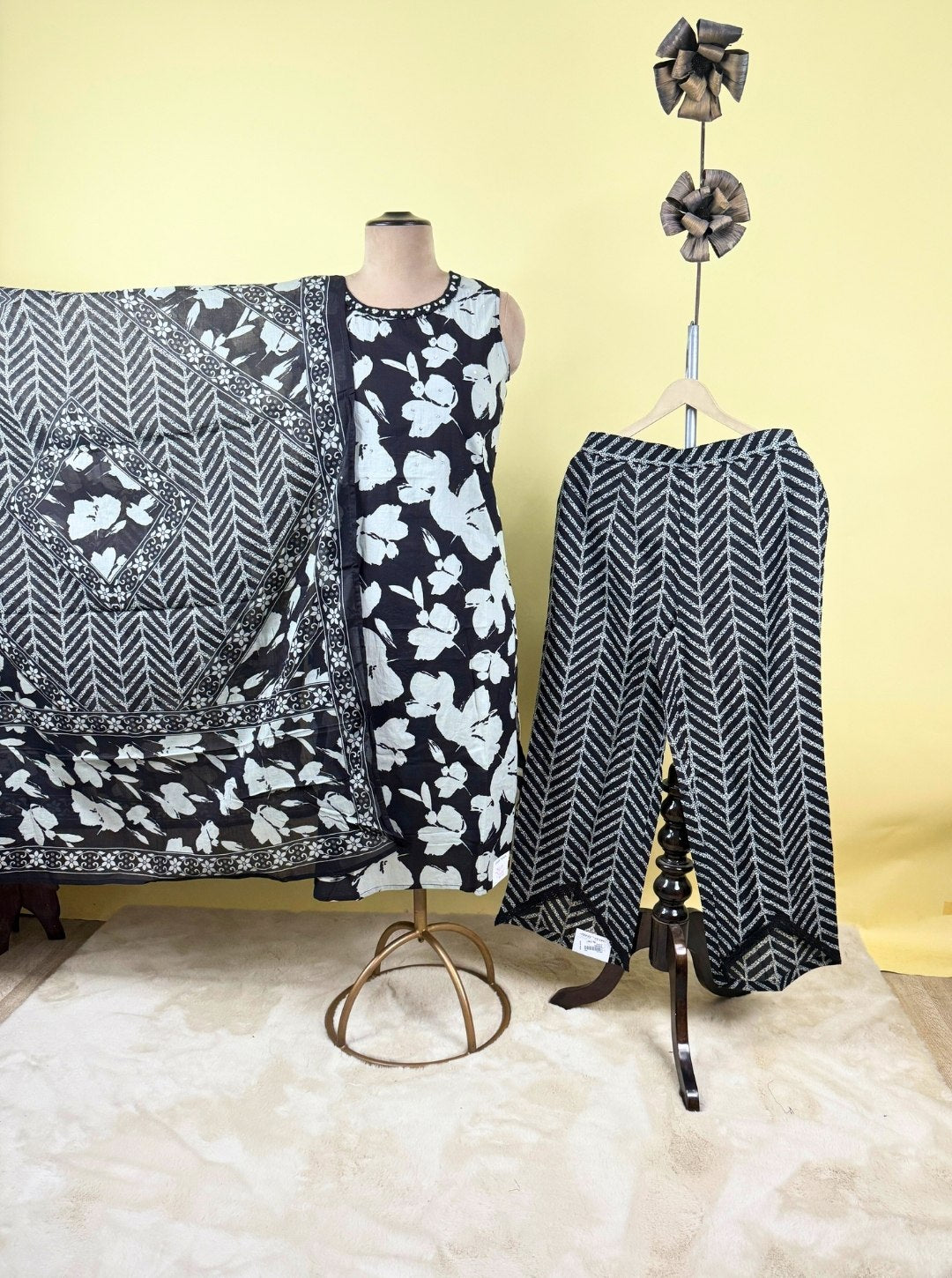 BLACK DIGITAL PRINT KURTA WITH SEQUIN & MIRROR NECK, GEO PANT & MUL DUPATTA (KUR1005)