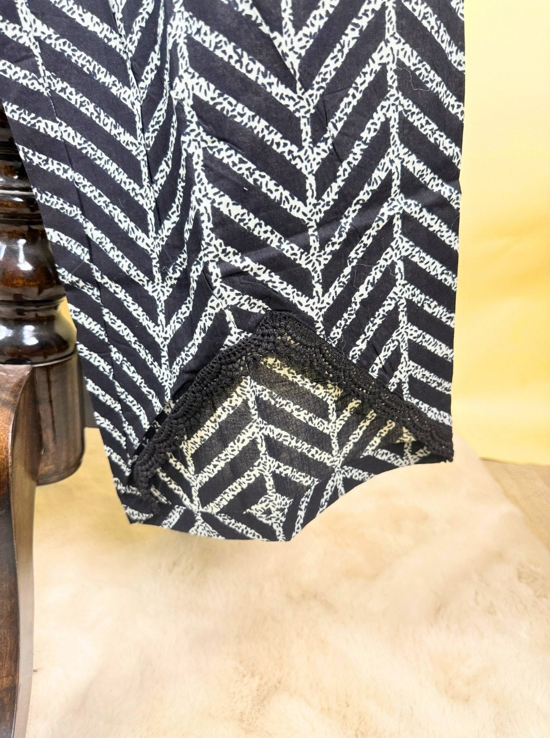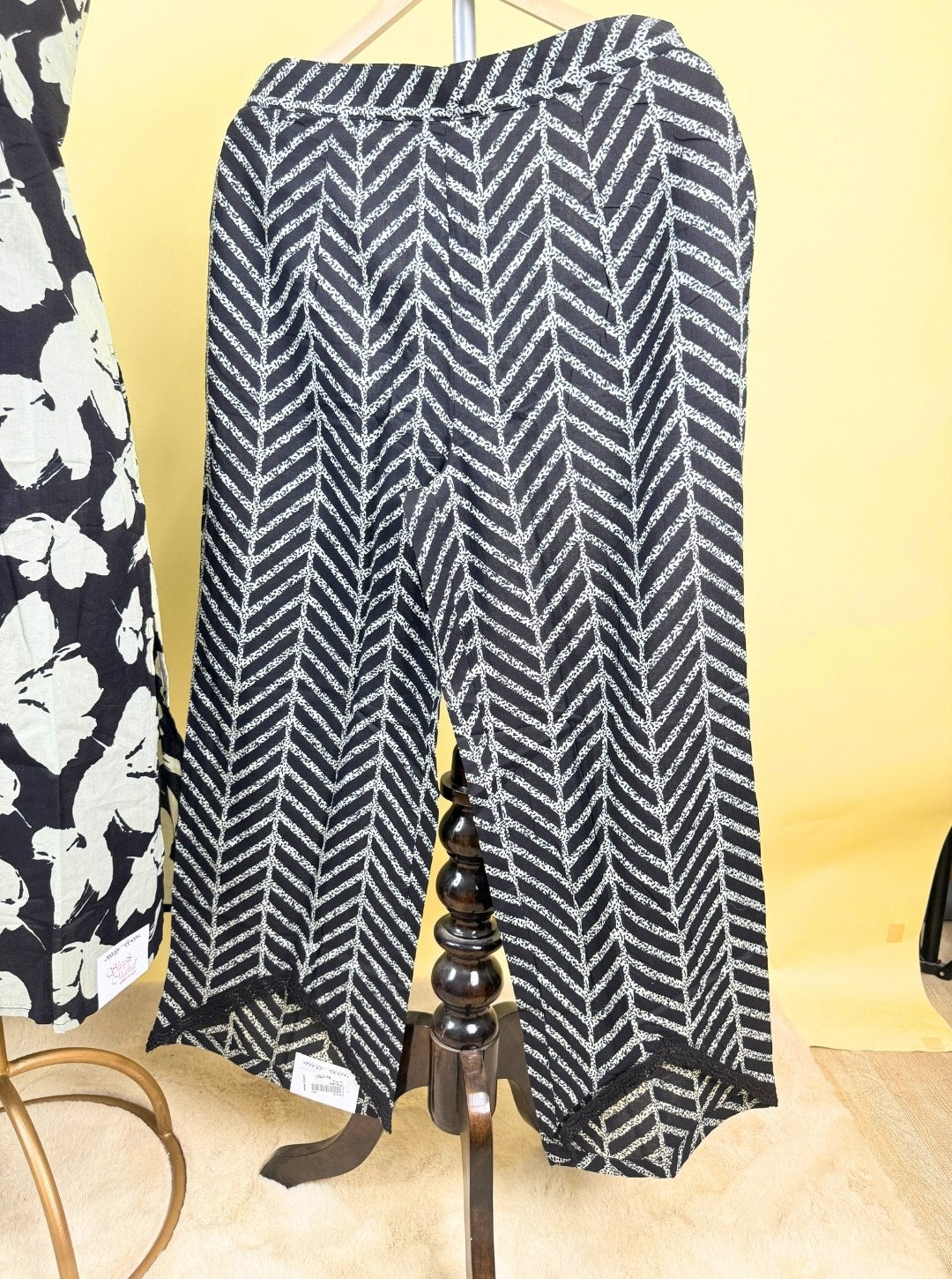 - Geometrical print pants with a stylish cut and lace detailing, blending tradition with trend.
