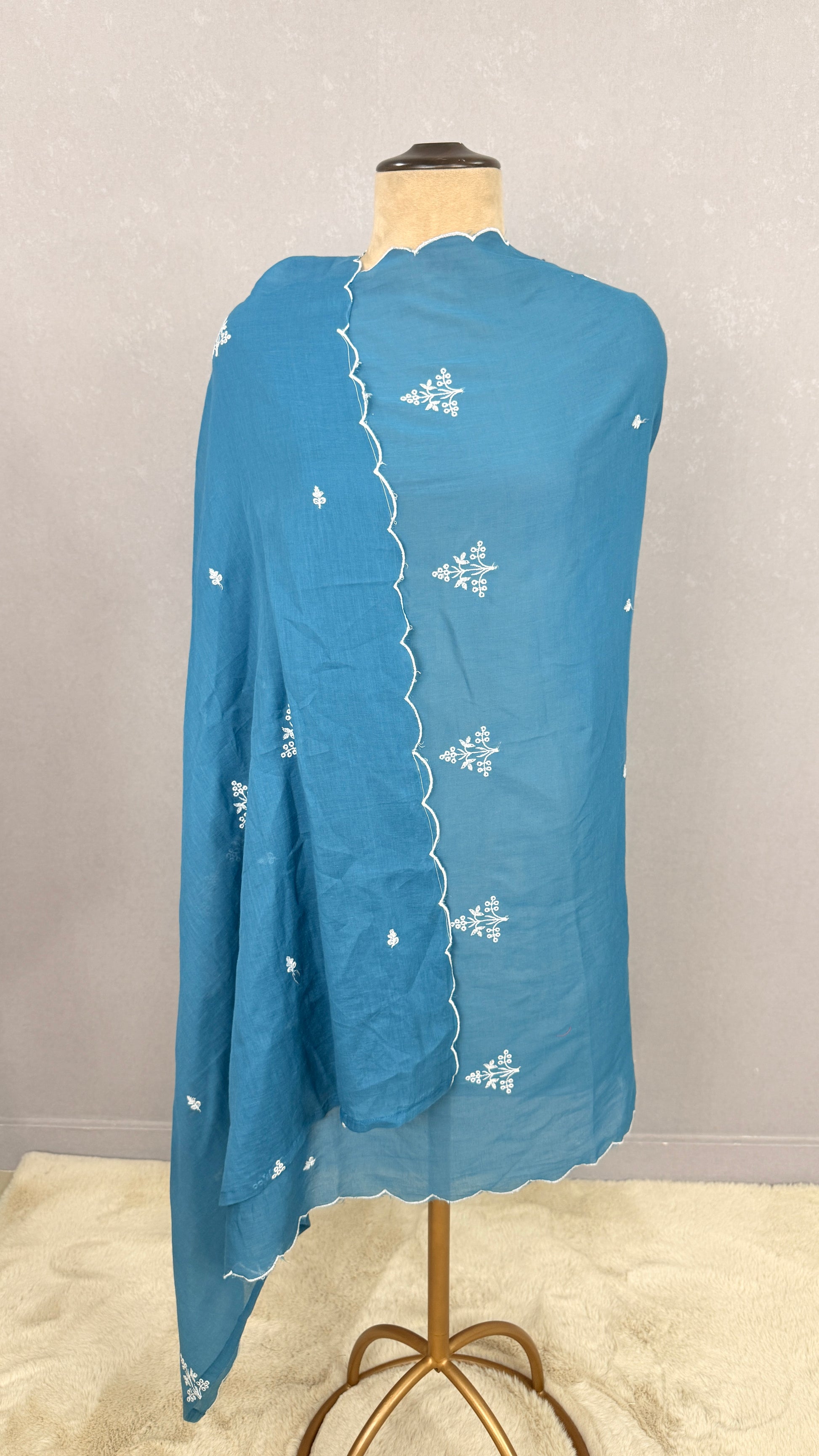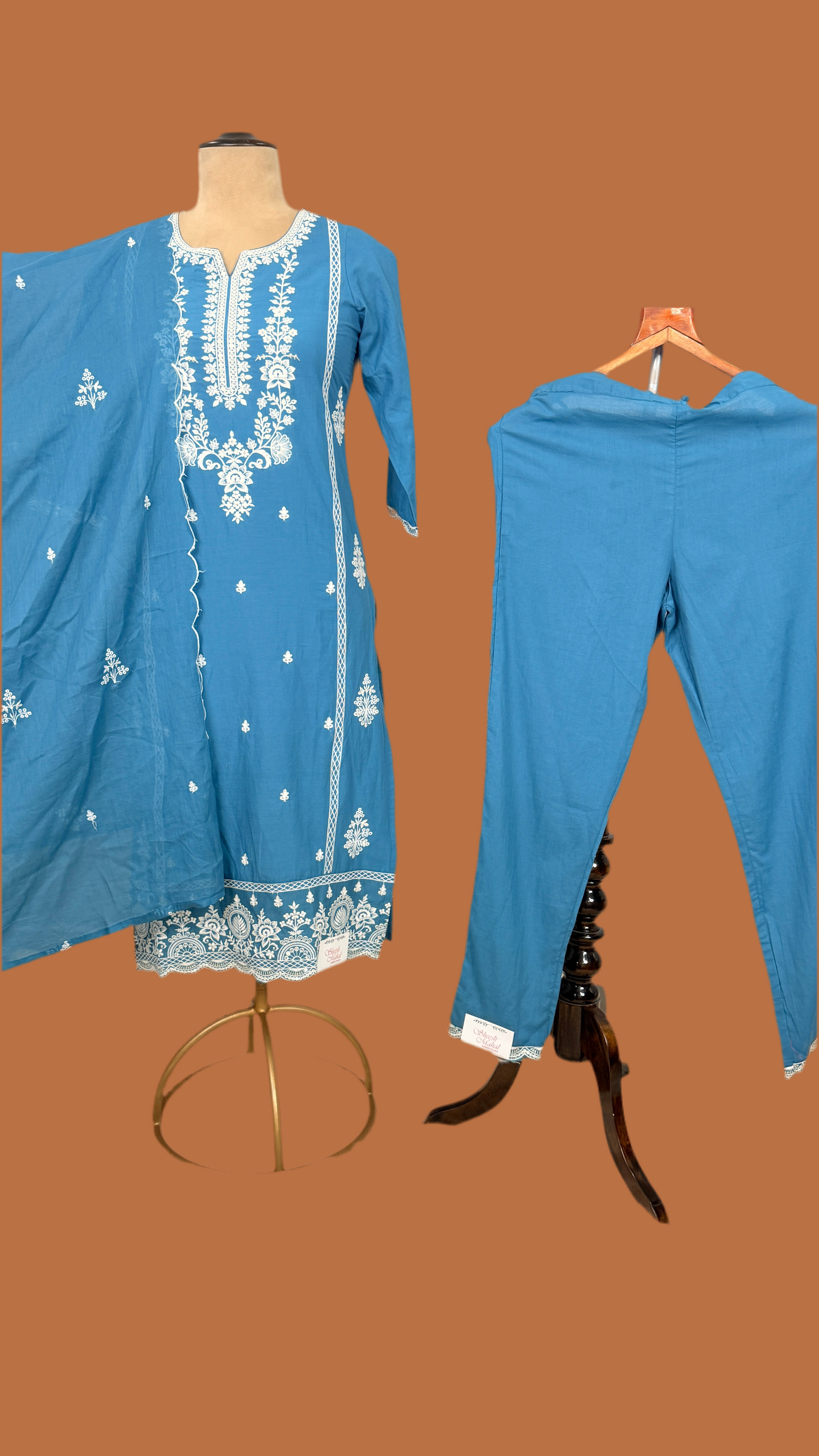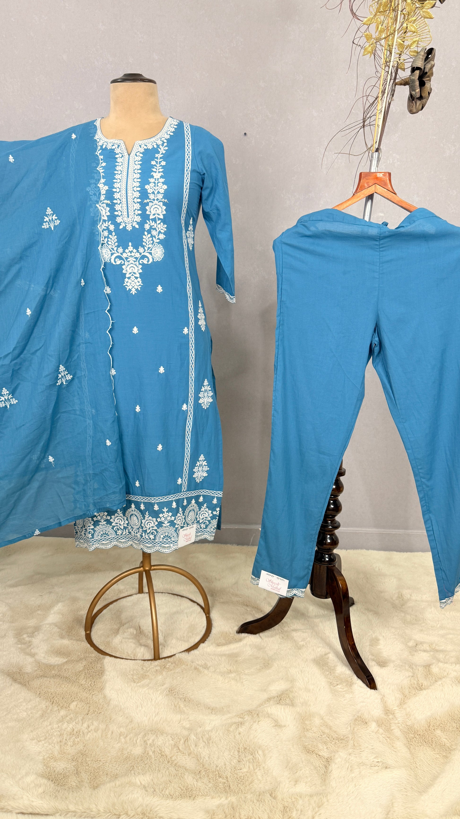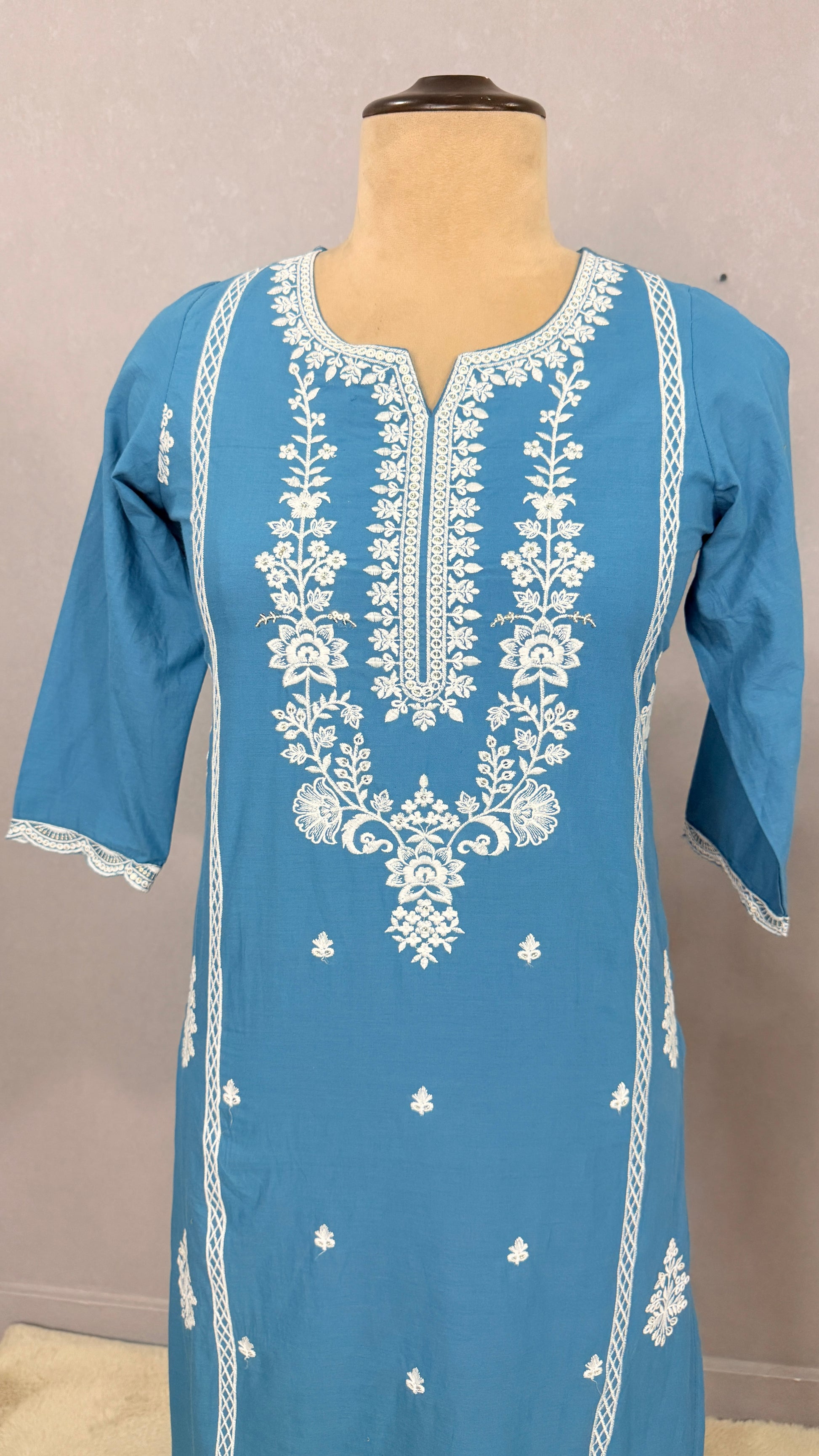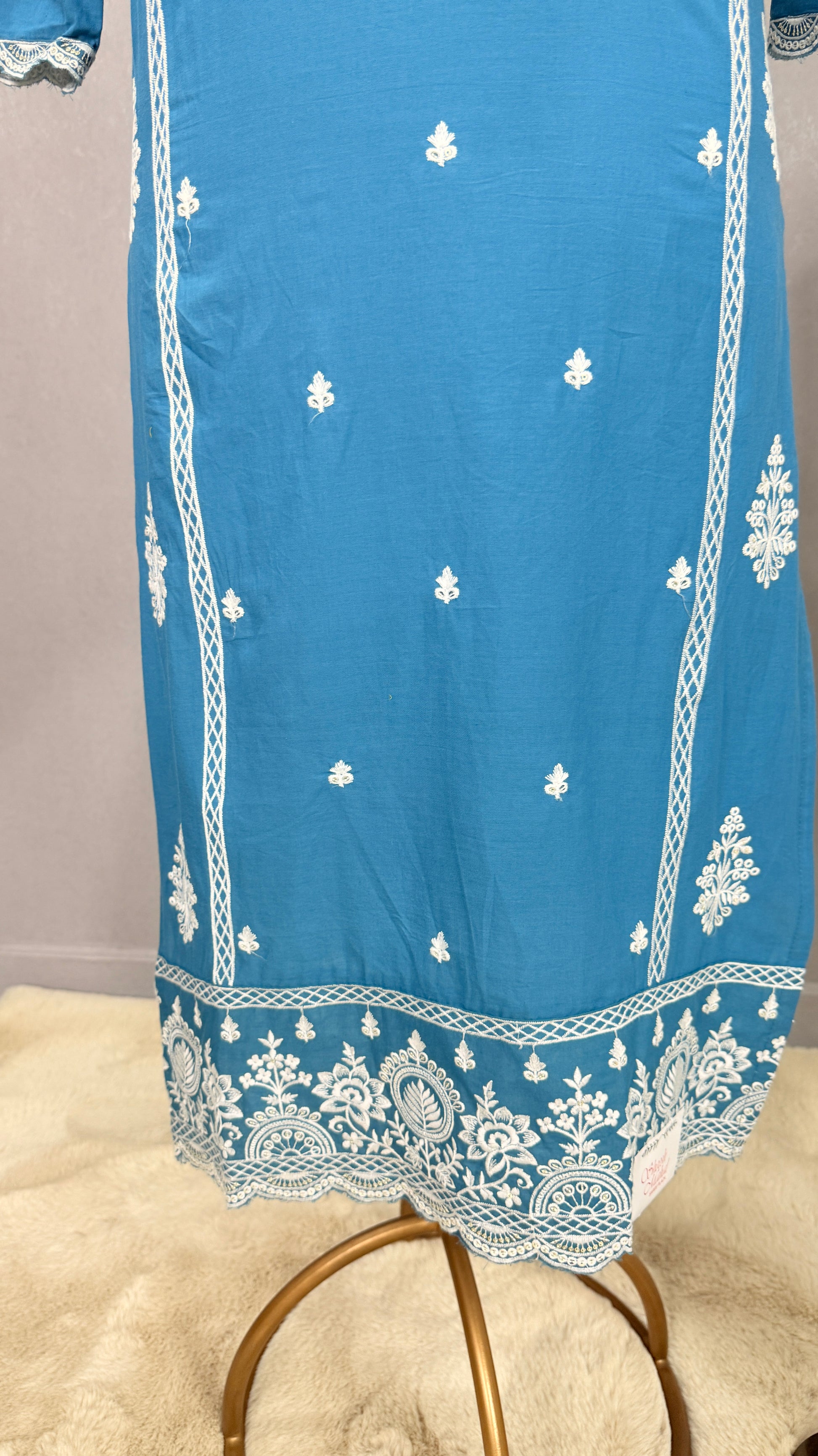Blue cotton kurta pant set with white Resham embroidered kur2002