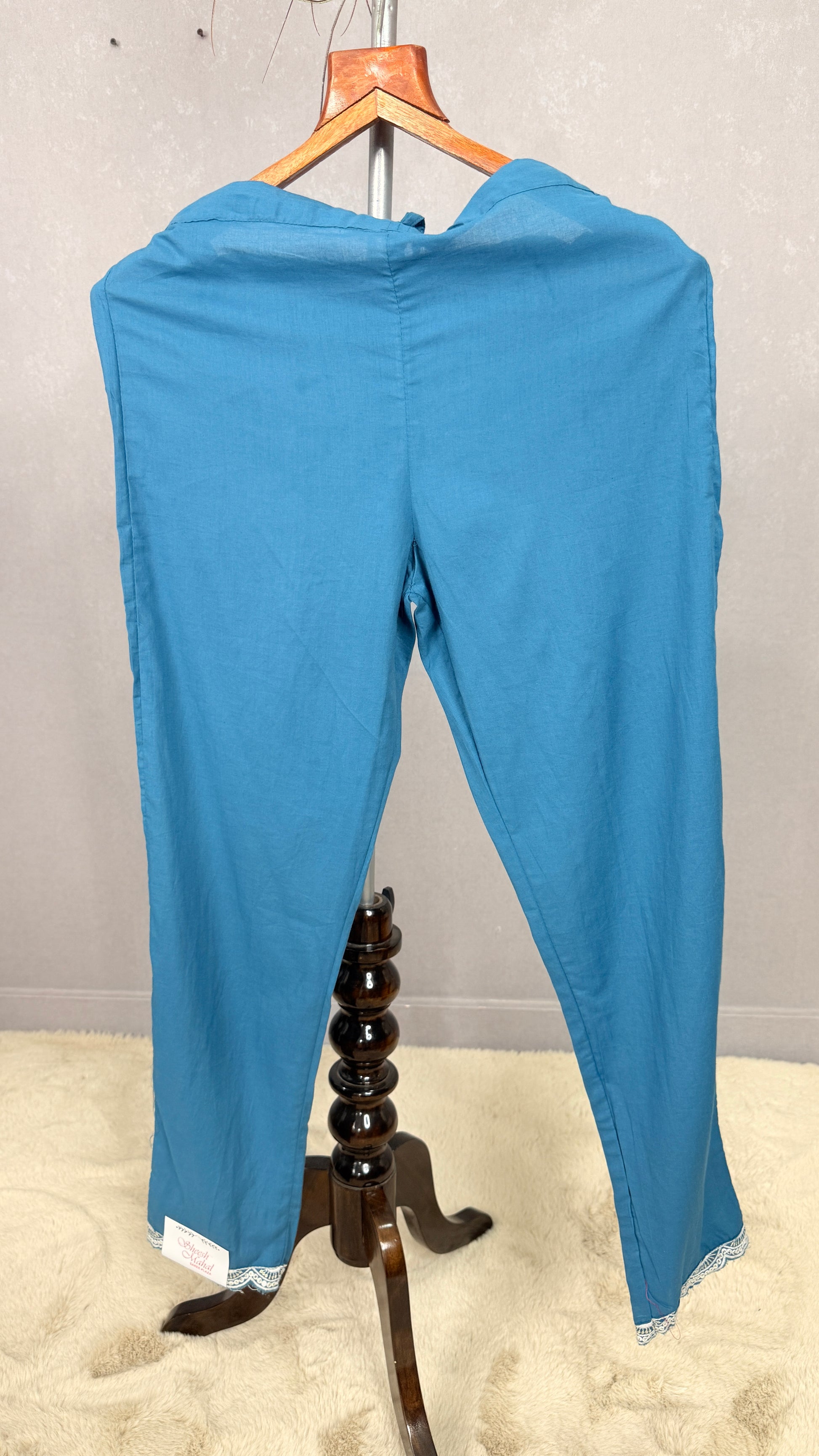 Expertly crafted from 100% cotton, our blue kurta pant features delicate white Resham embroidery. Comfortable and stylish, this kurta pant is the perfect addition to any wardrobe. Experience the luxury and elegance of handcrafted embroidery with our beautiful kurta pant.