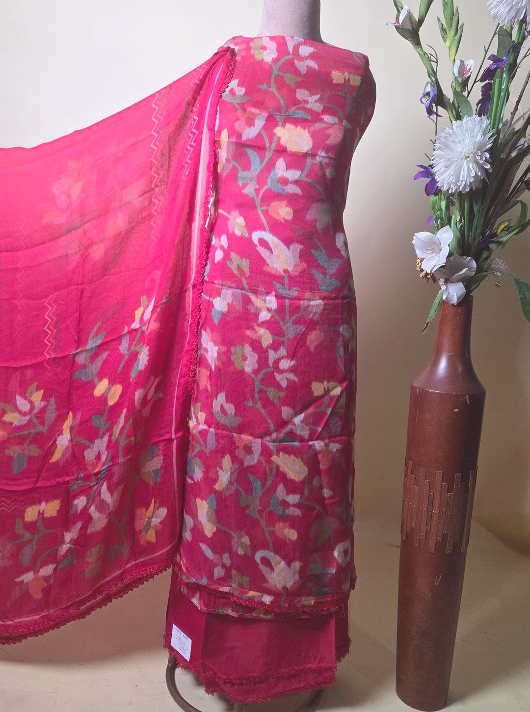 - Dupatta: Matching floral printed with lace edging and woven chevron pattern