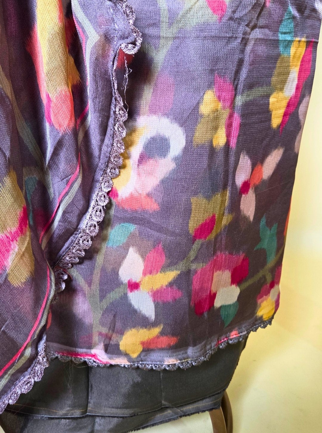 Drape yourself in elegance with this Burberry-style unstitched suit, featuring a rich charcoal-grey base enhanced by an all-over watercolour floral print. The look is further elevated with a coordinated dupatta showcasing a zigzag border motif and lace detailing that adds a graceful finish.