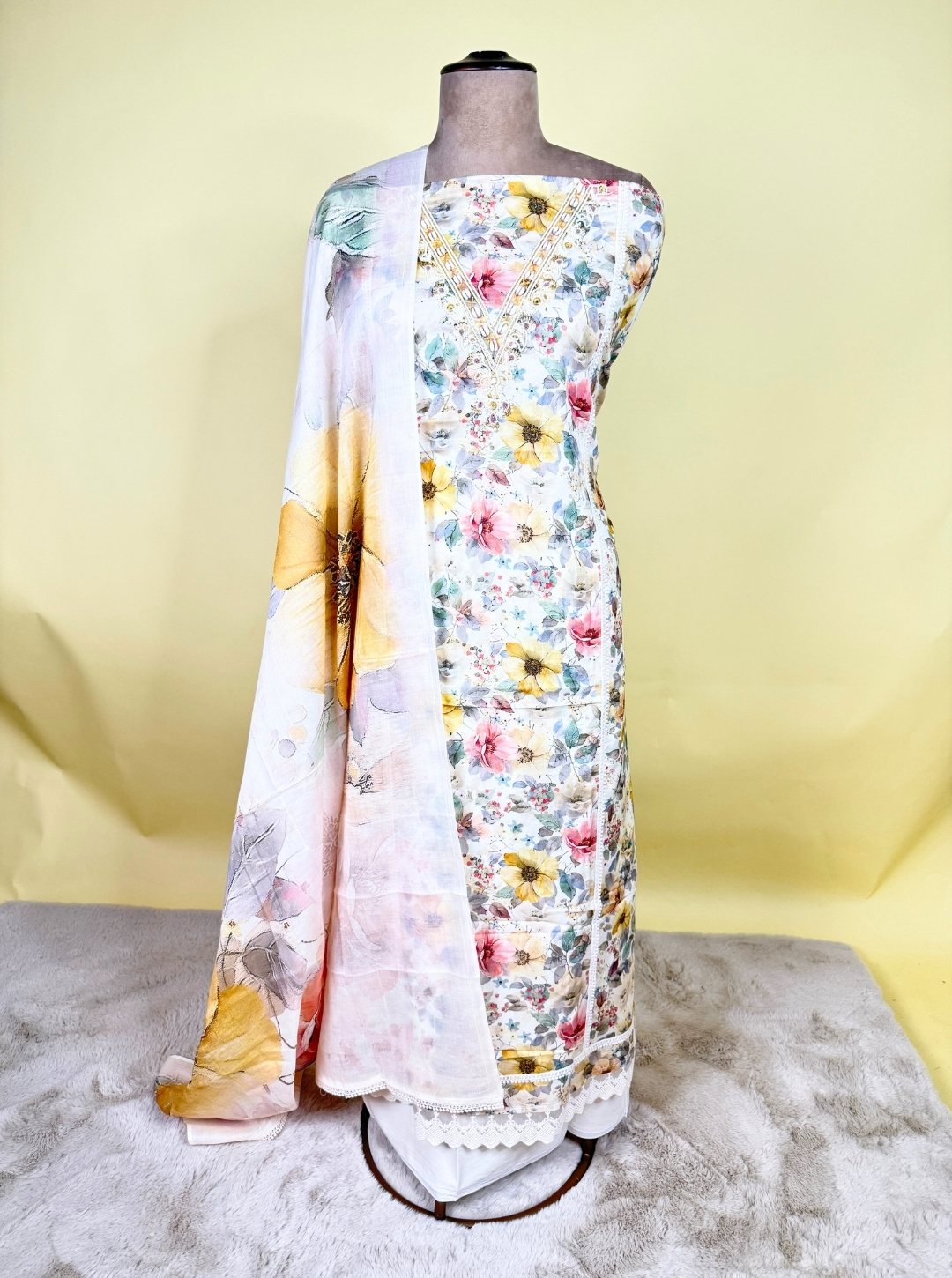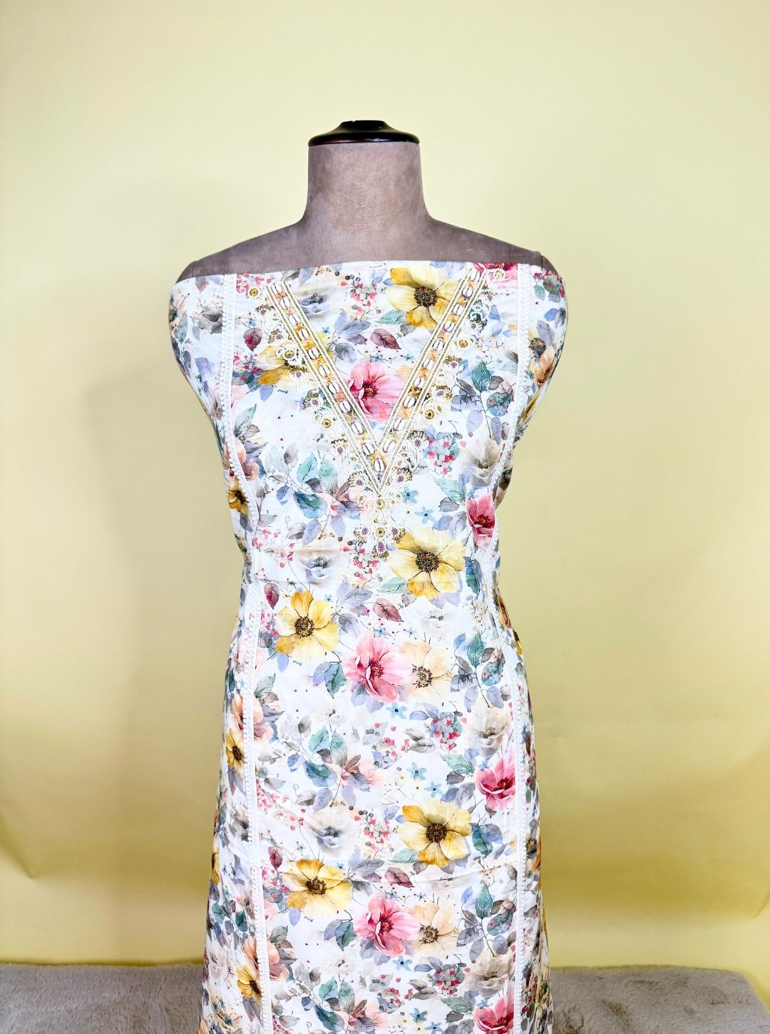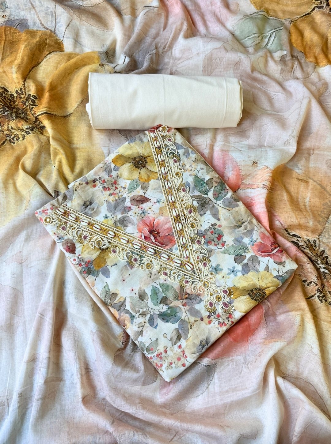 - Top Fabric: Cambric cotton with floral block print & pearl-embellished neckline