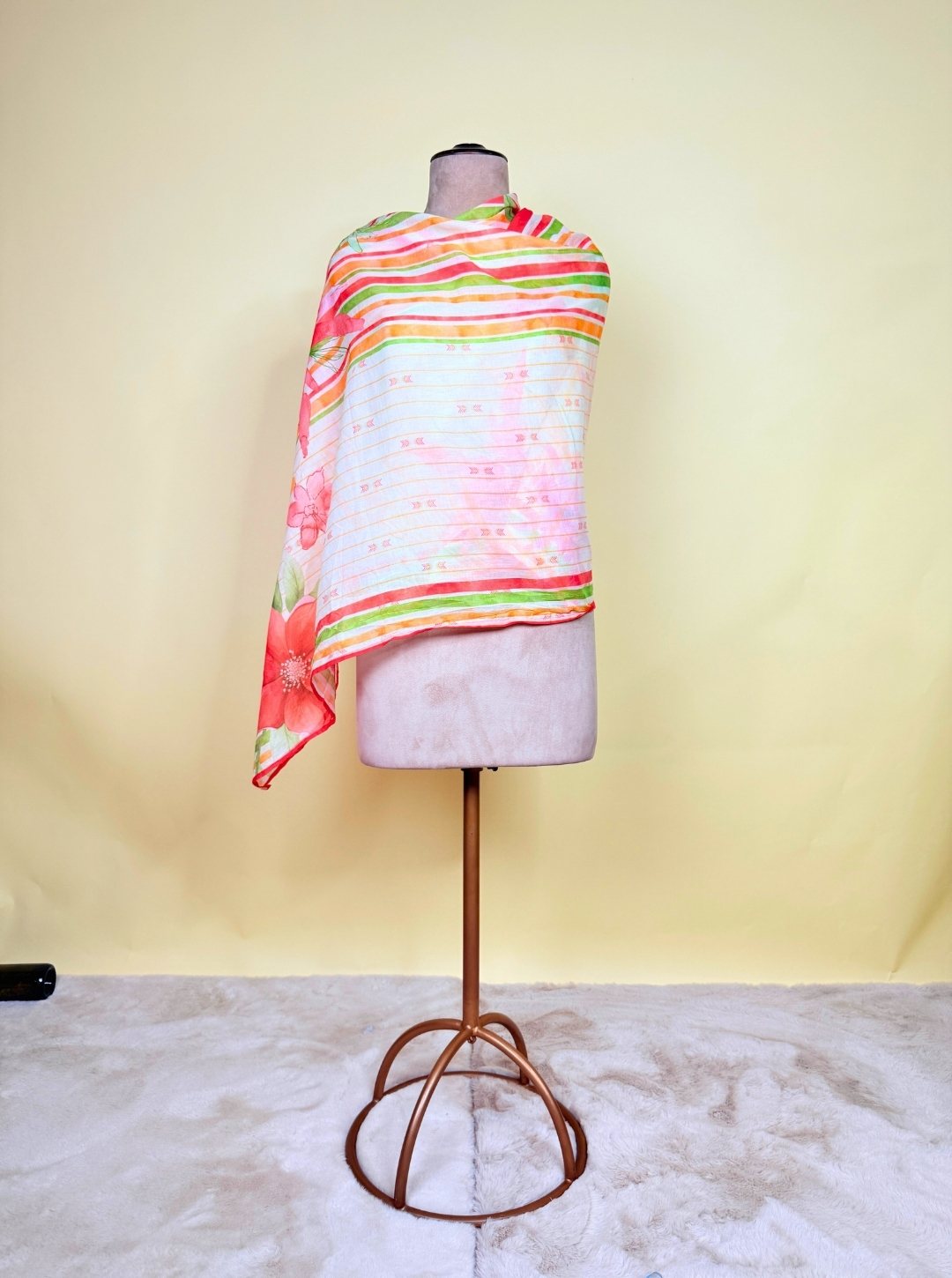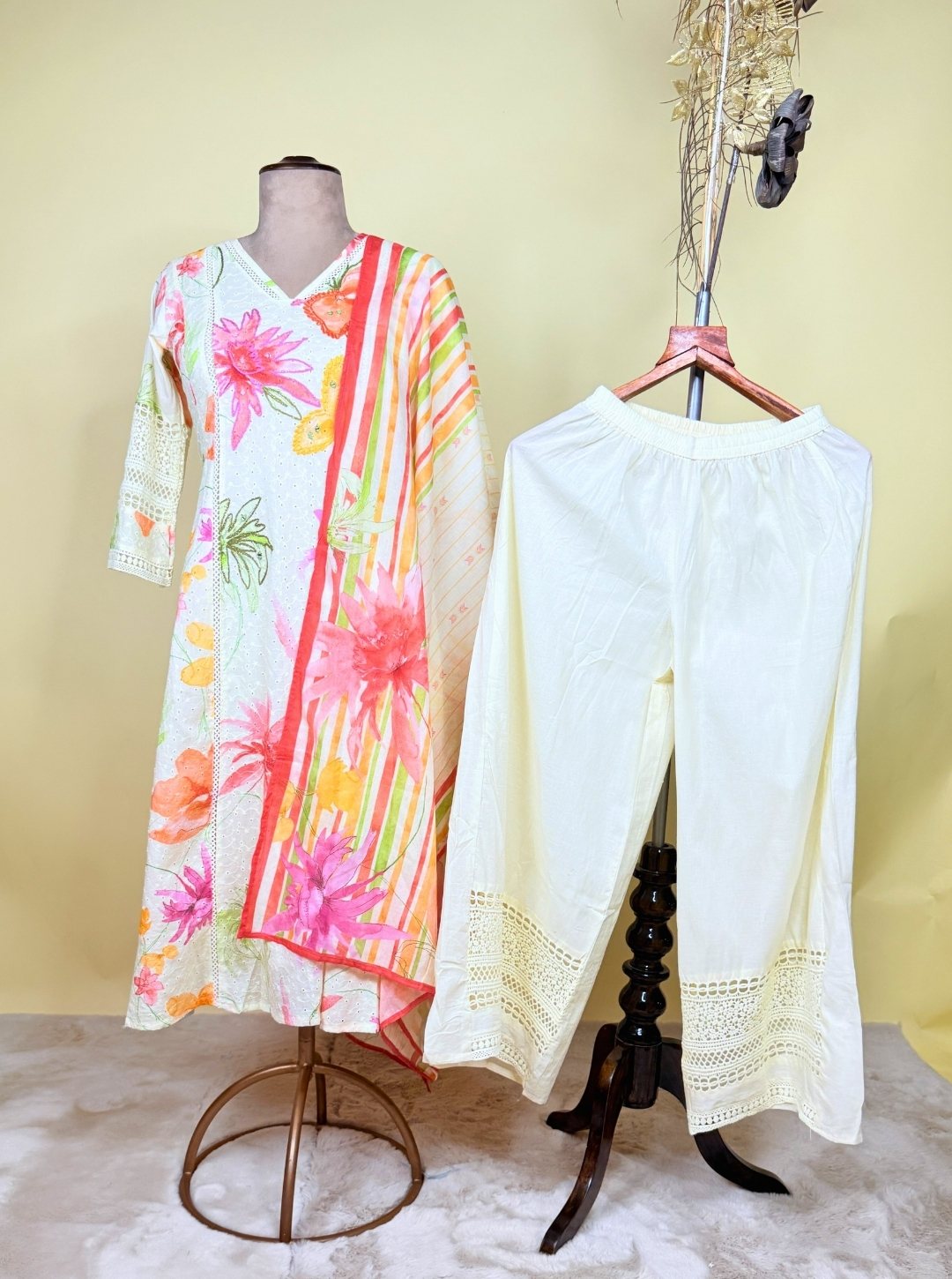 - Dupatta: Lightweight mul cotton with vibrant floral handprint