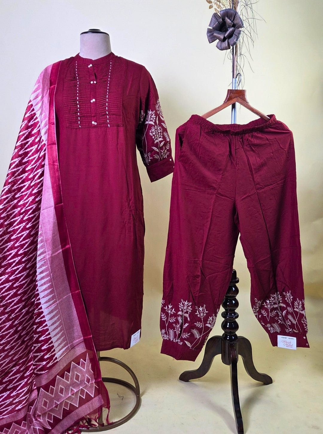 Make a bold statement with this uniquely designed Cotton Kurta Set featuring Afghani-style embroidered sleeves, a roomy Afghani Salwar, and a quirky Zigzag-patterned Dupatta. This set brings together global influence and Indian aesthetics — a refreshing take on ethnic wear.