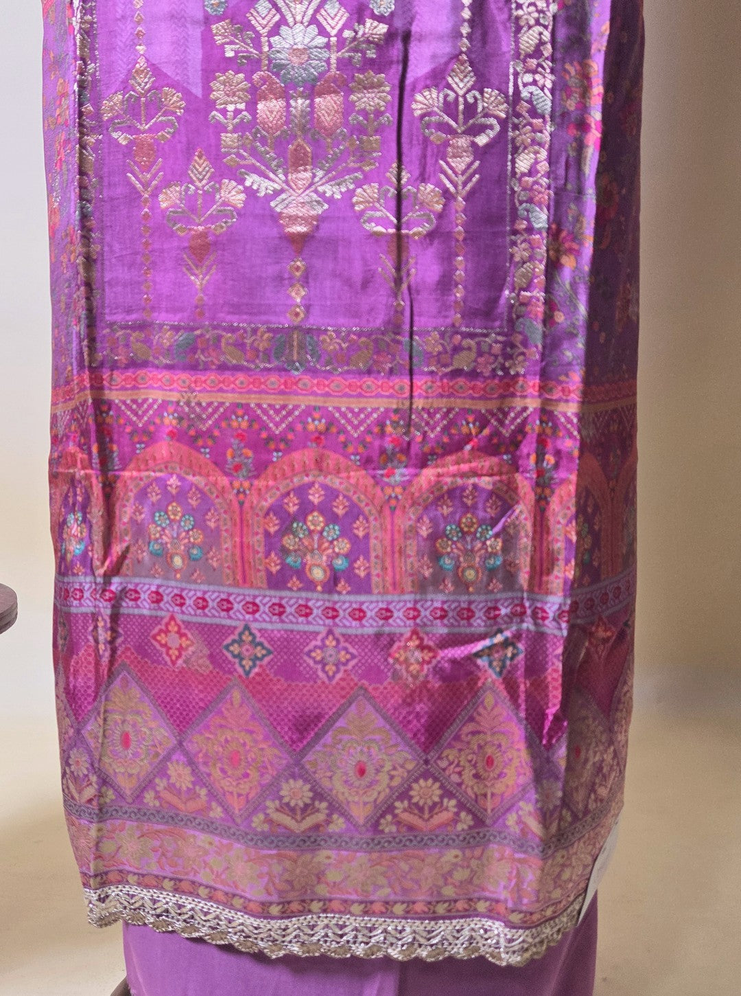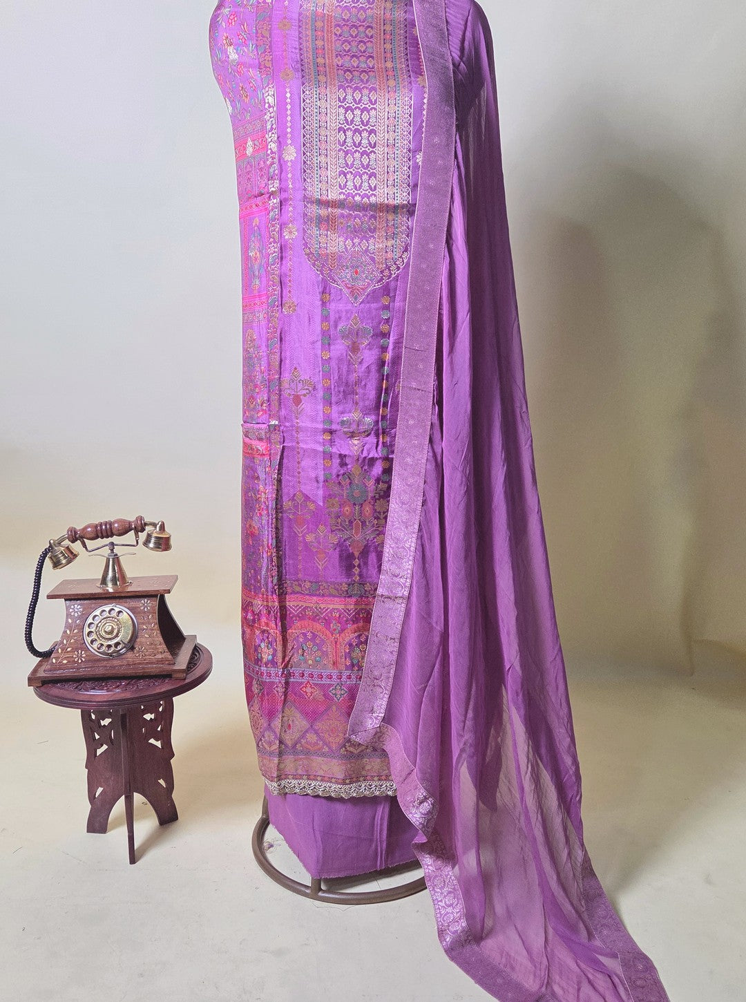 Elevate your ethnic wardrobe with this elegant Crape Dola unstitched suit, drenched in a sophisticated lavender hue and detailed with ornate digital prints inspired by traditional Indian artistry. The design features majestic architectural motifs and intricate floral vines, enhanced with a subtle shimmer that adds a touch of regal charm.