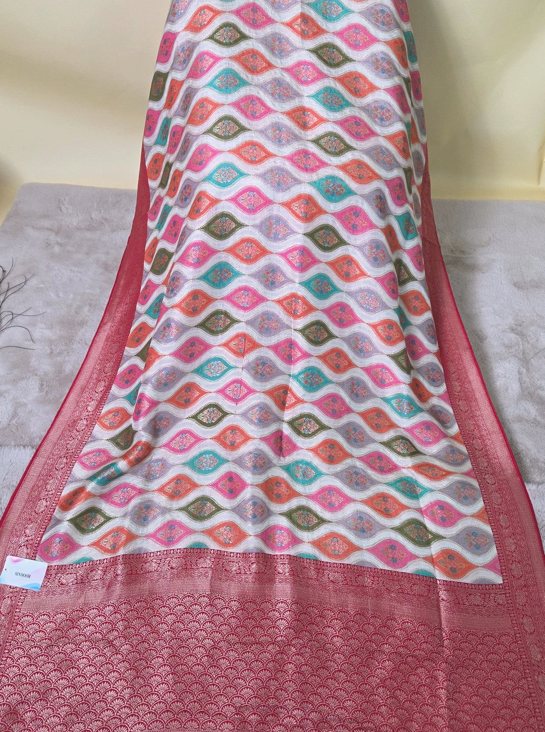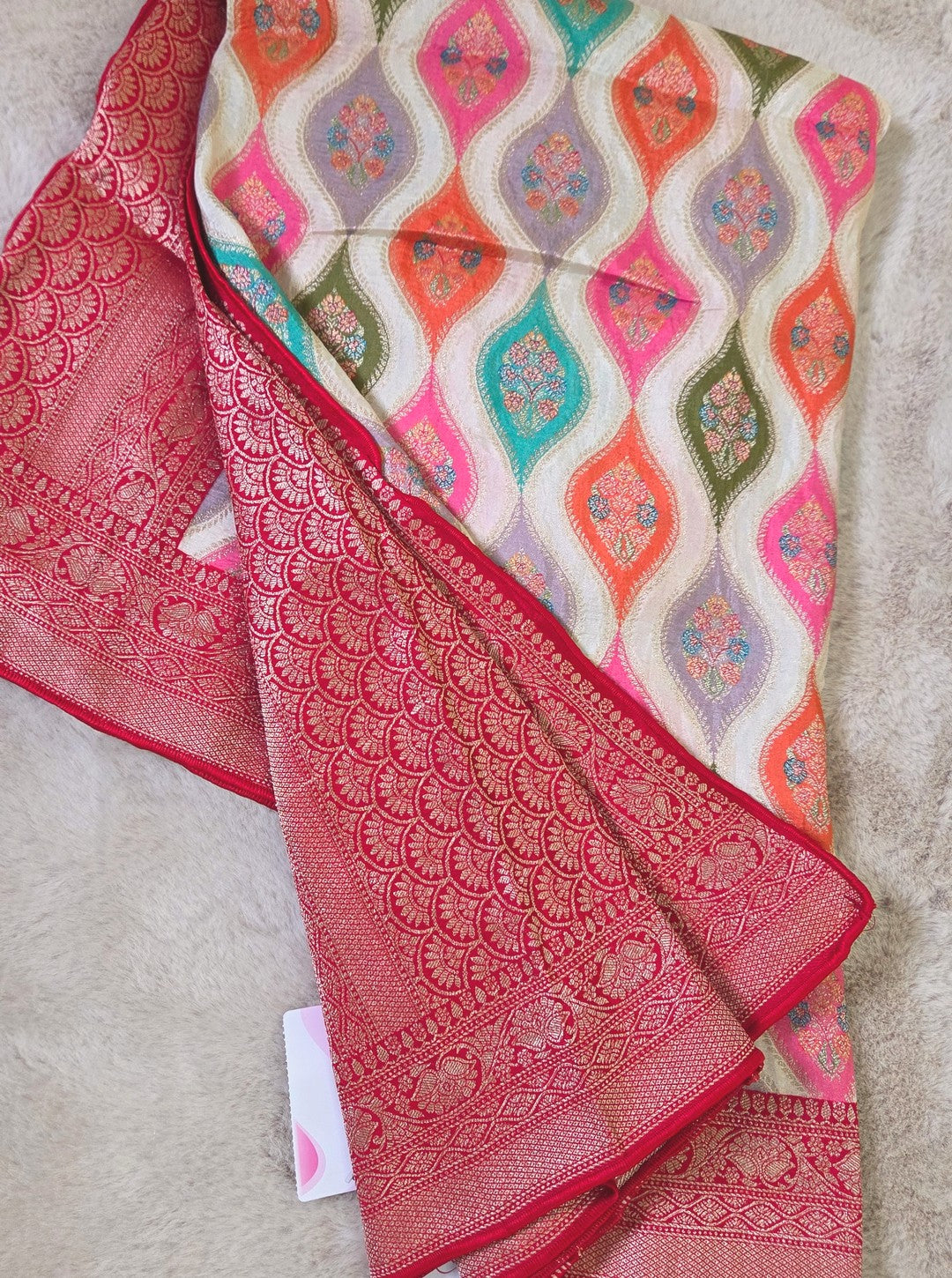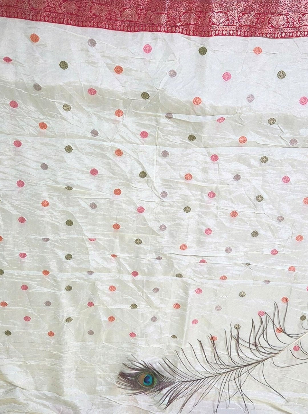 Elevate your ethnic wardrobe with this exquisite Crape Silk Rangkāt Saree, drenched in a soft vanilla base highlighted by multicolour woven motifs. The showstopper feature is its opulent red Banarasi border, intricately designed with floral and peacock motifs in shimmering zari—adding timeless grandeur.
