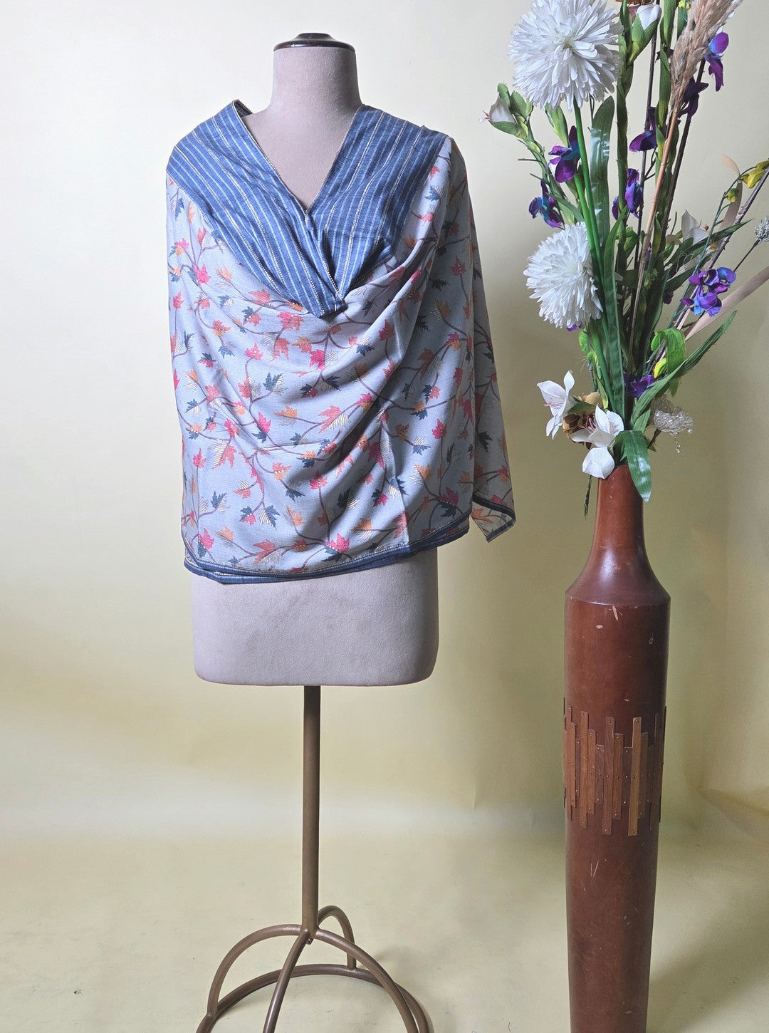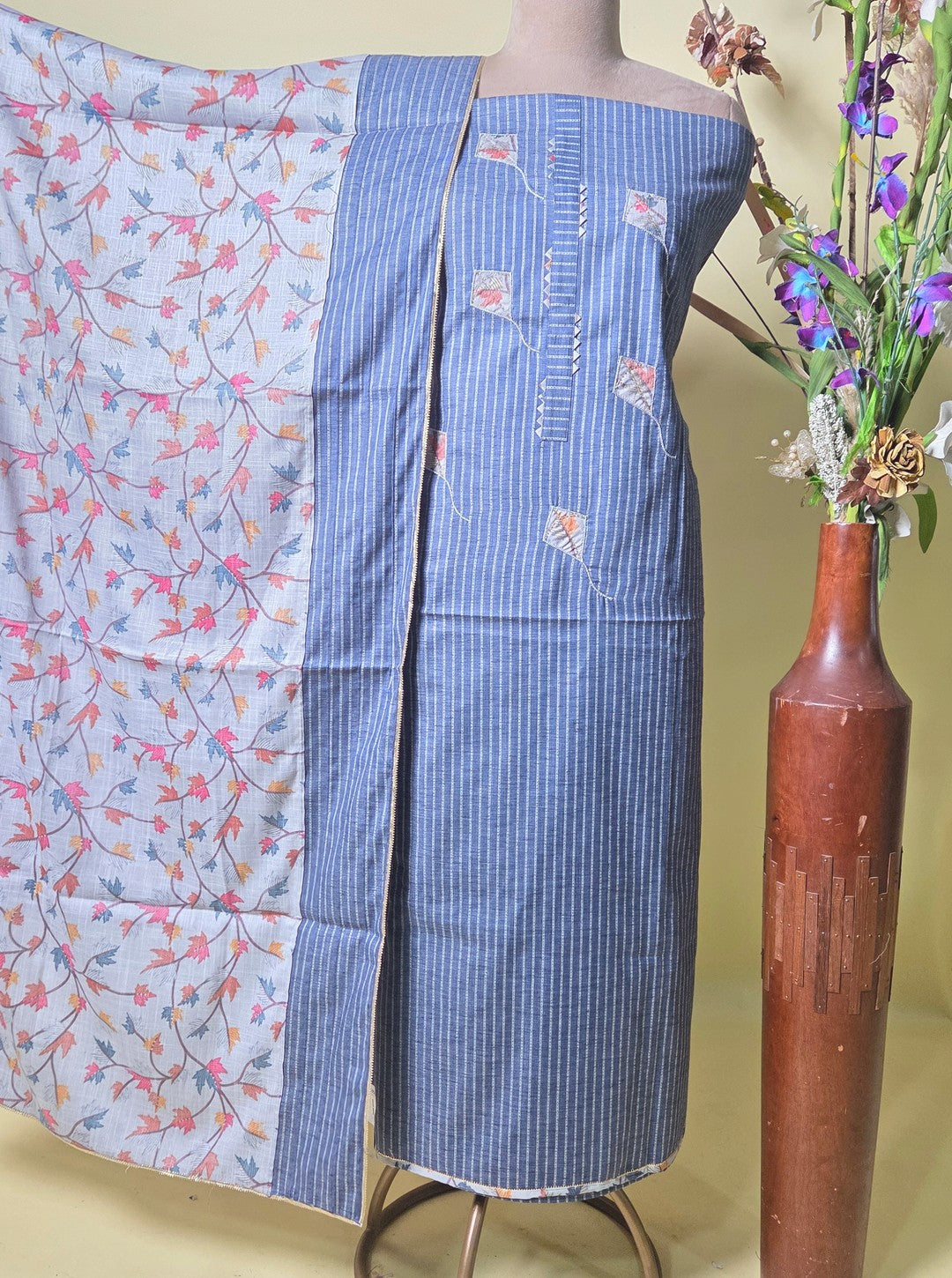 Gracefully blending contemporary charm with ethnic elegance, this handloom cotton unstitched suit in a denim blue tone is perfect for effortless everyday styling. The kurta features delicate thread embroidery over vertical white stripes, offering a neat, modern finish. The accompanying dupatta, in contrast, blooms with soft floral vines in pastel hues over a white base—adding a refreshing splash of colour.