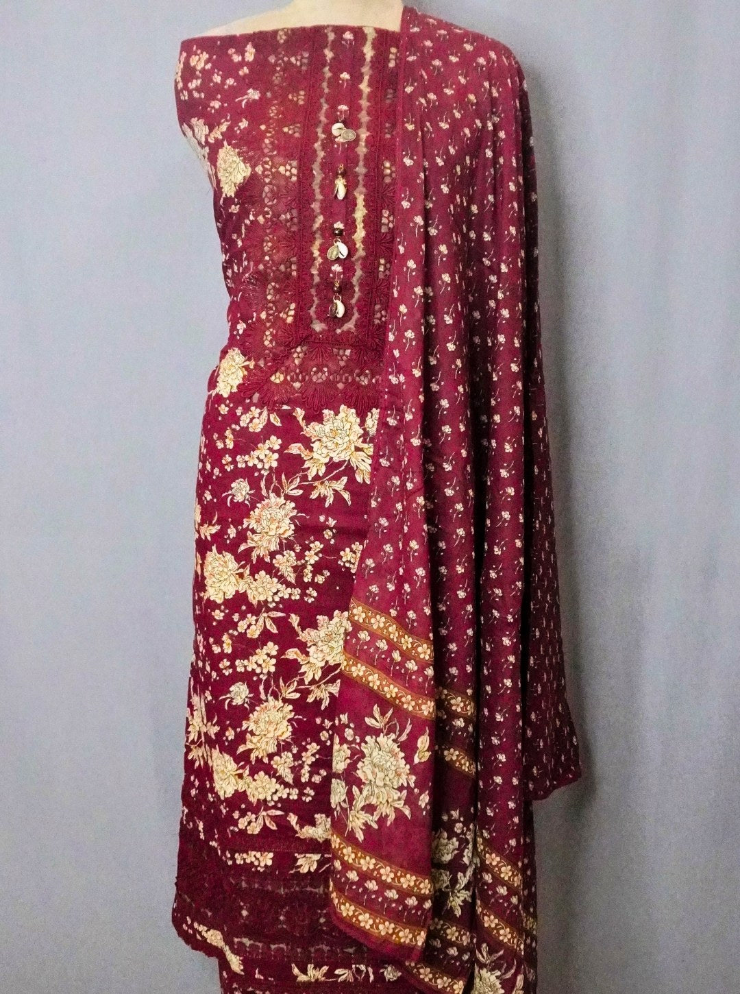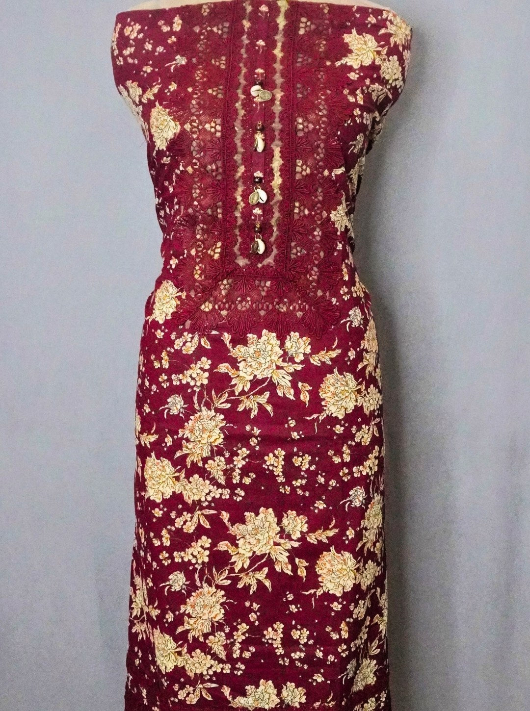 COTTON MAHROON LACE, FLOWER PRINT SUIT