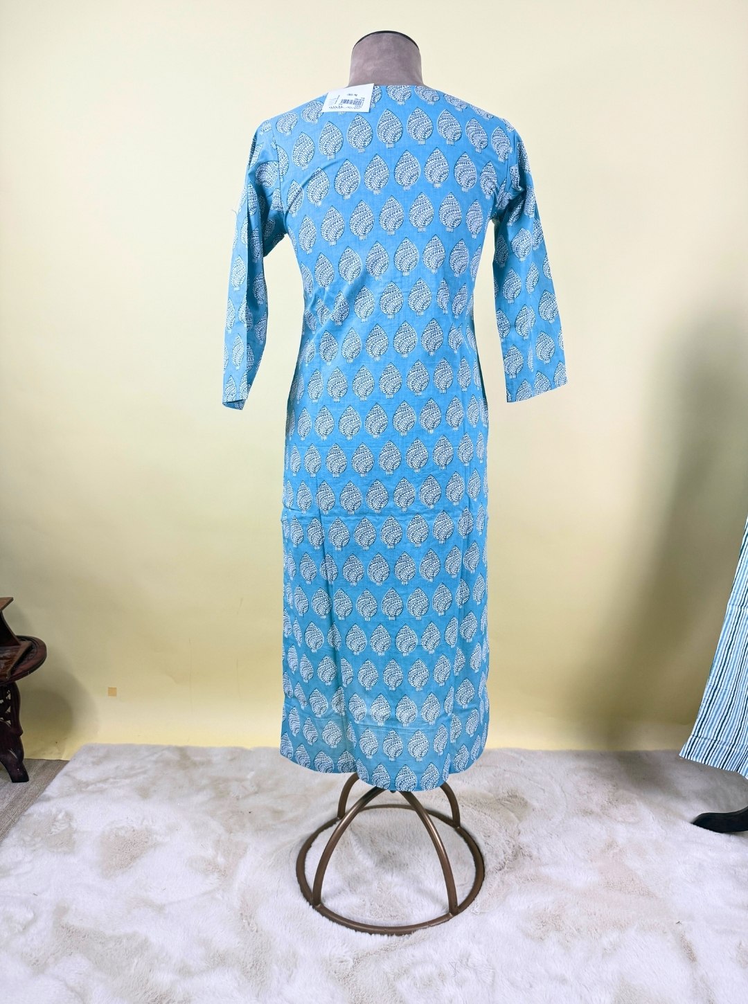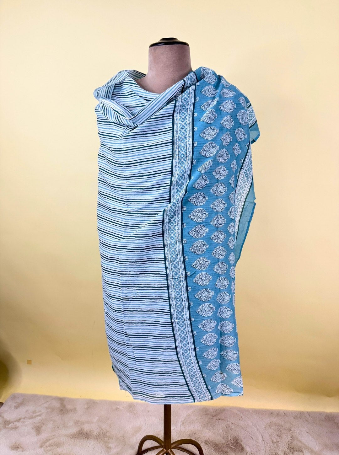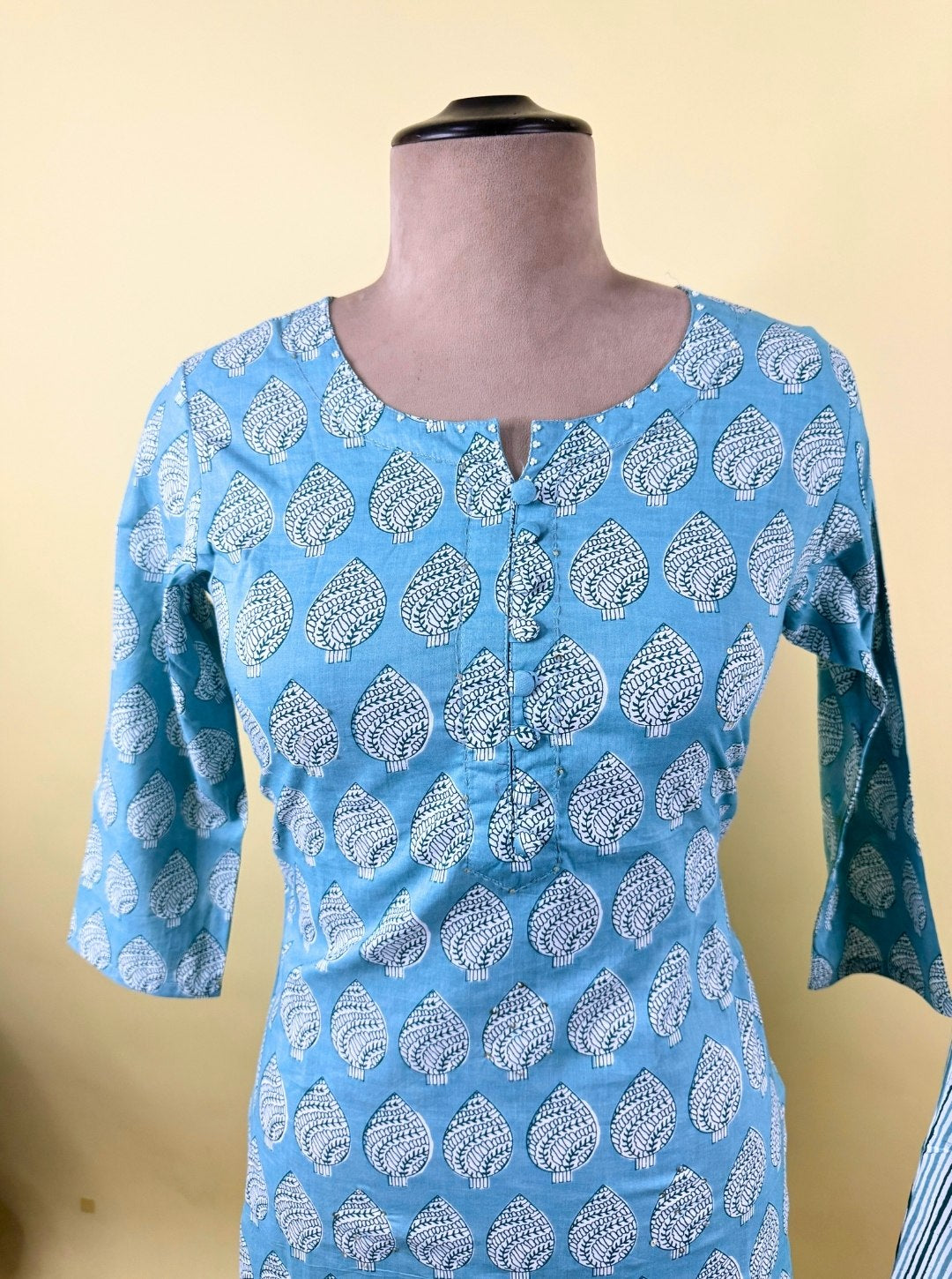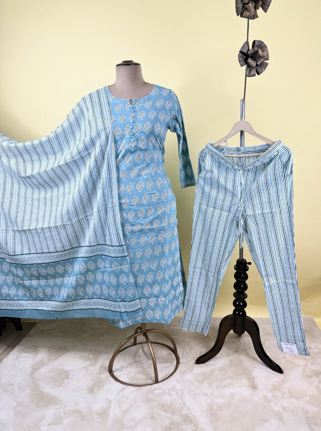 ICE BLUE BAGRU KURTA WITH PEARL & SEQUIN DETAIL, STRIPE PANT & MUL DUPATTA (KUR1004)