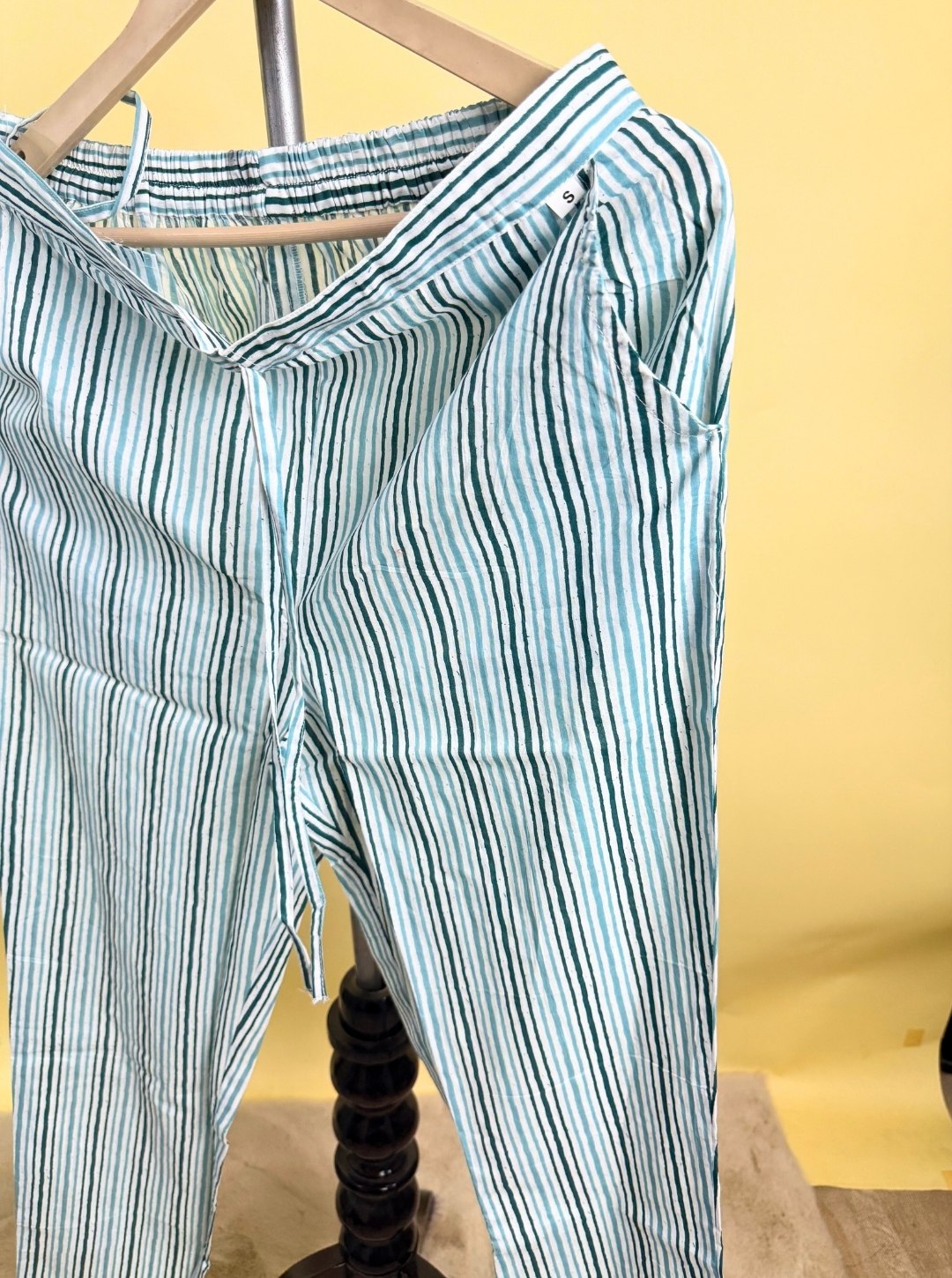 Coordinated stripe-patterned pants that add a modern contrast to the traditional print.