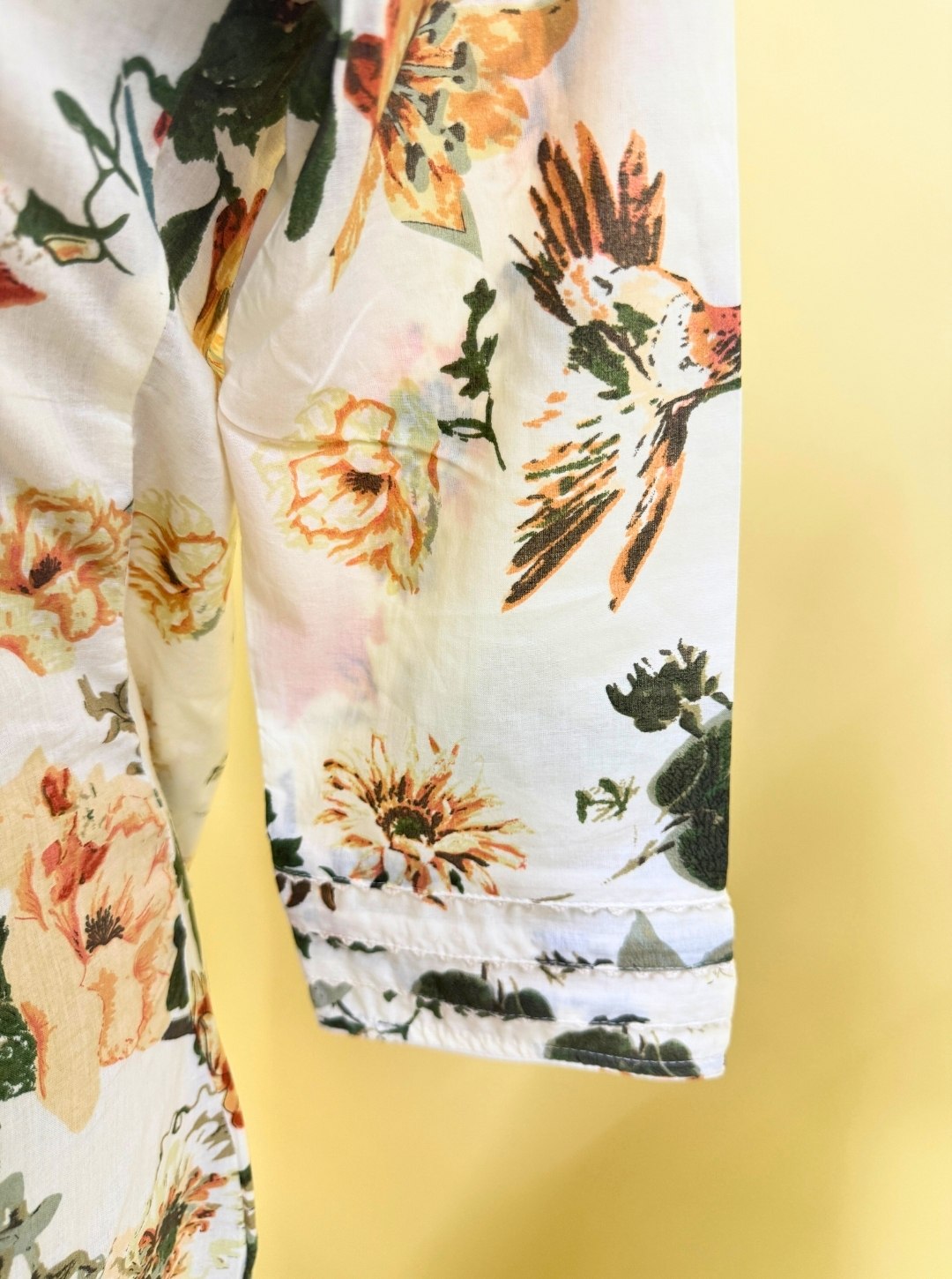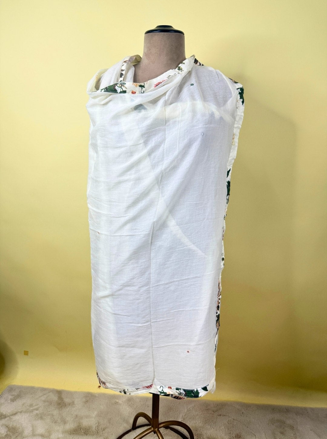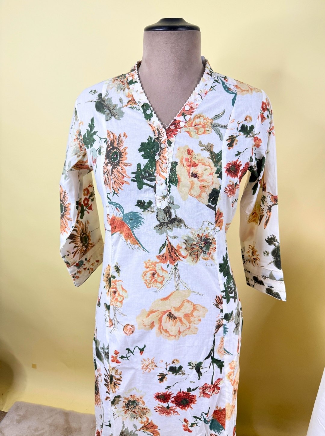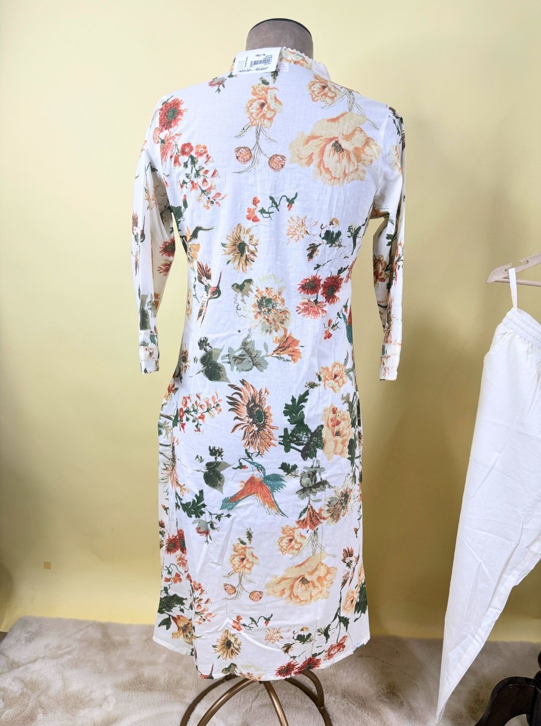 An ivory A-line kurta with delicate floral print, highlighted by a refined Japanese neckline and subtle hand embroidery.