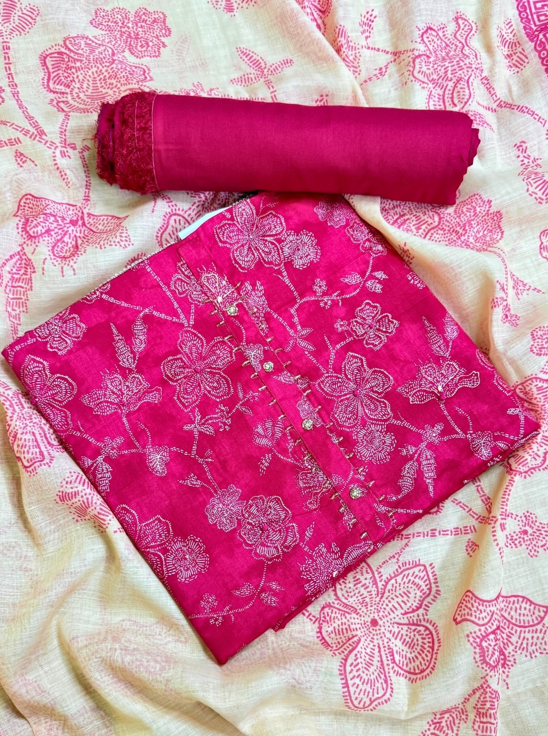 Make a graceful statement with this luxurious magenta jaam cotton suit set, designed with festive elegance in mind. The ensemble includes: