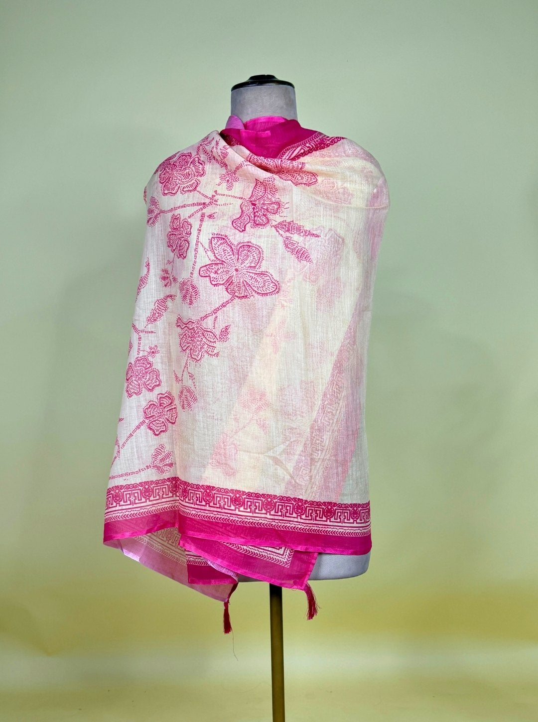 - A contrasting off-white linen-cotton dupatta with a magenta border and floral motifs for balanced sophistication.