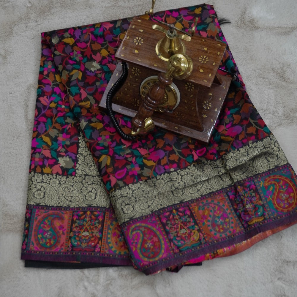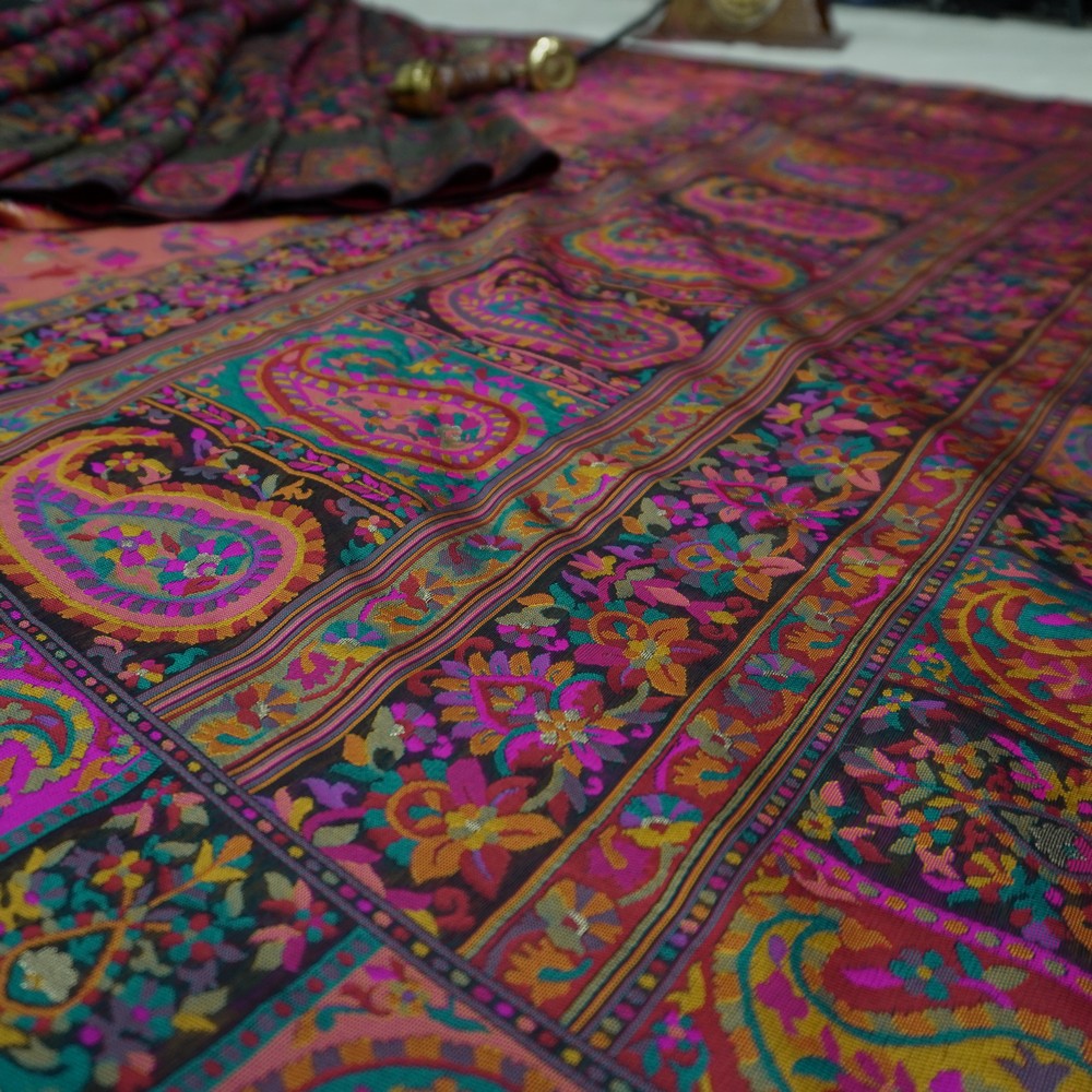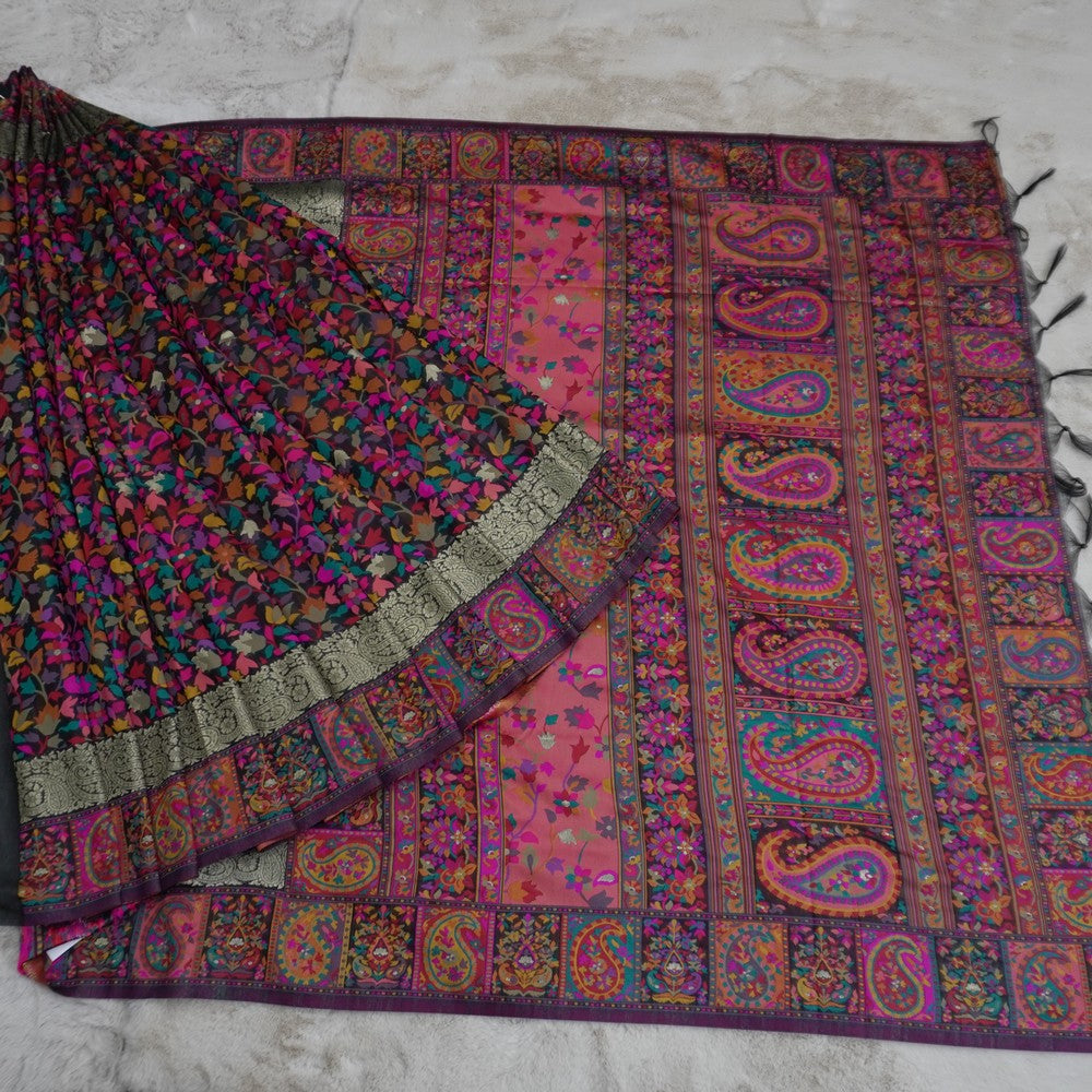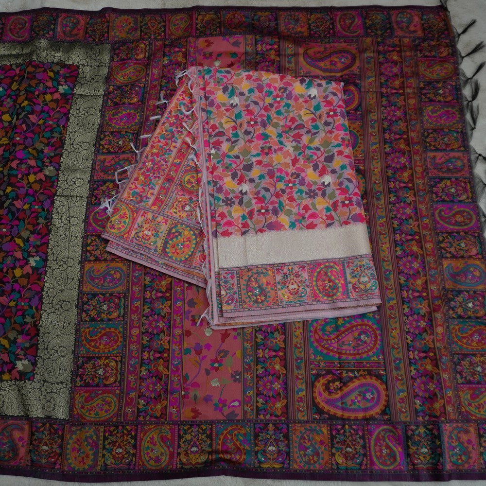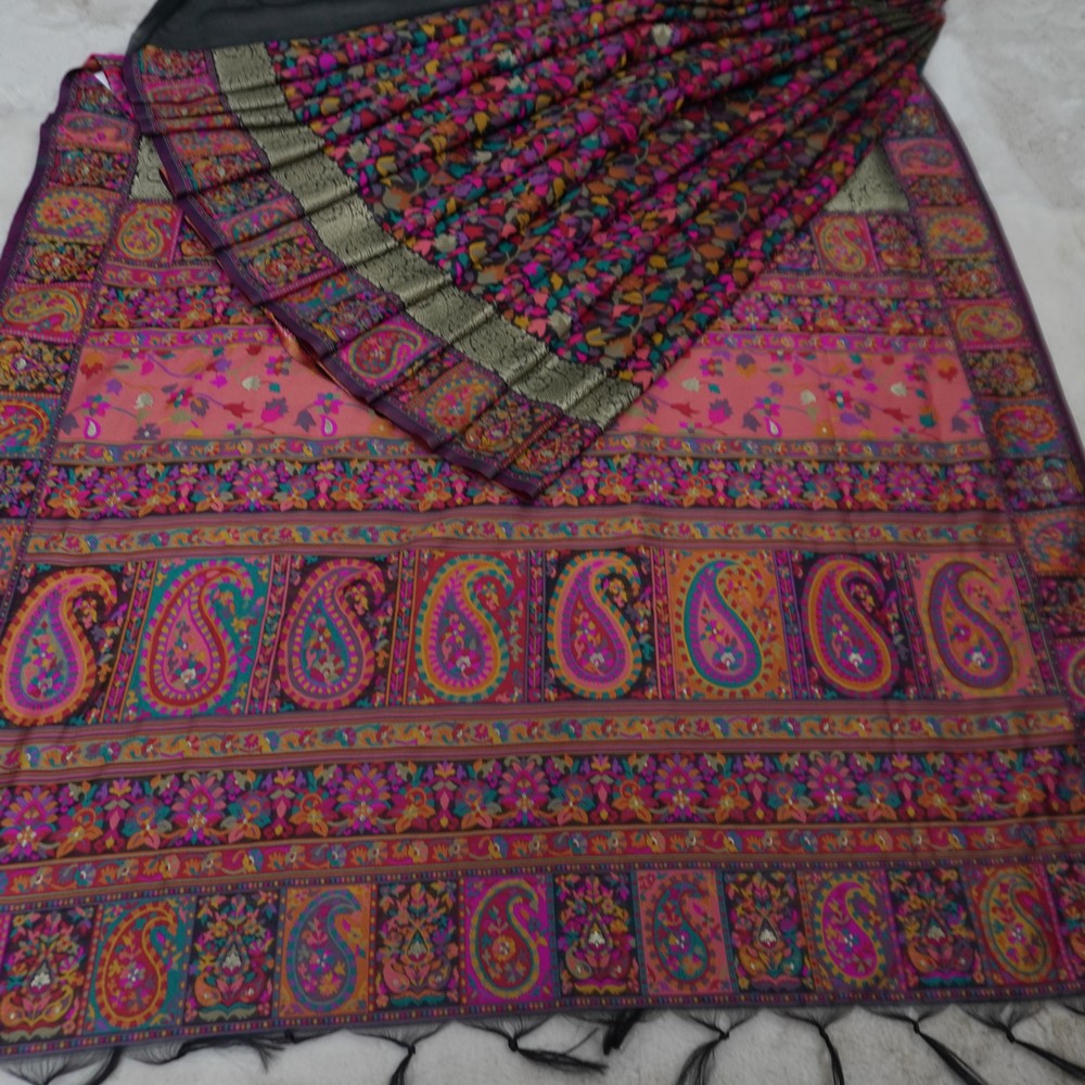 Discover the elegance of the KHASMIRI SAREE from SHEESH MAHAL. Crafted with exquisite detail, this traditional garment showcases the rich heritage and intricate craftsmanship of Kashmir. Elevate your style with this luxurious and timeless piece.