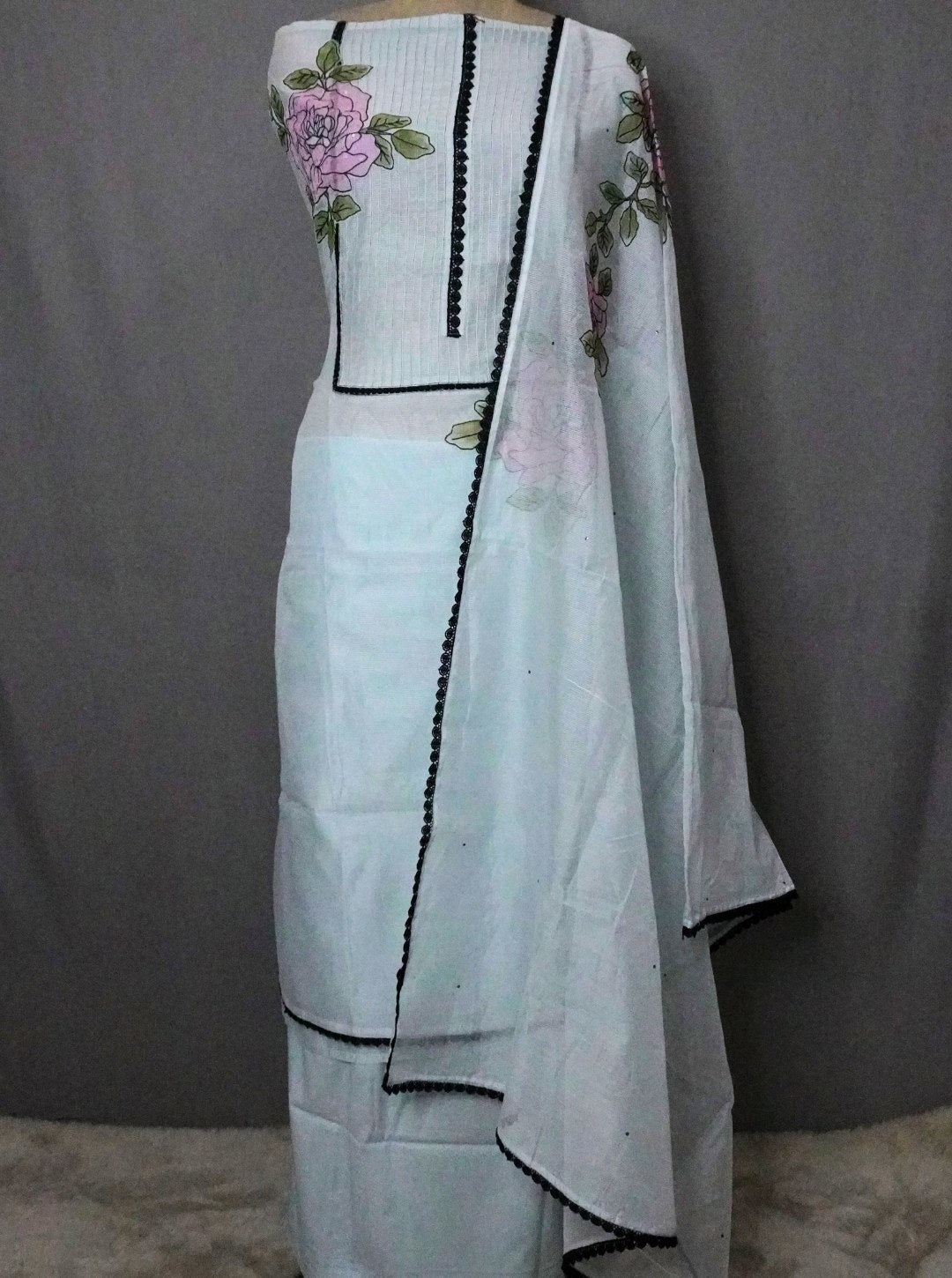 This elegant KOTA CHECKS DUSTY GREY HAND PRINT FLOWER SUIT features a sophisticated floral design, delicately embellished with shimmering sequins, creating a truly stunning and unique look. The lightweight and breathable cotton bottom provides comfort and effortless style. Perfect for any occasion, this suit exudes grace and charm.