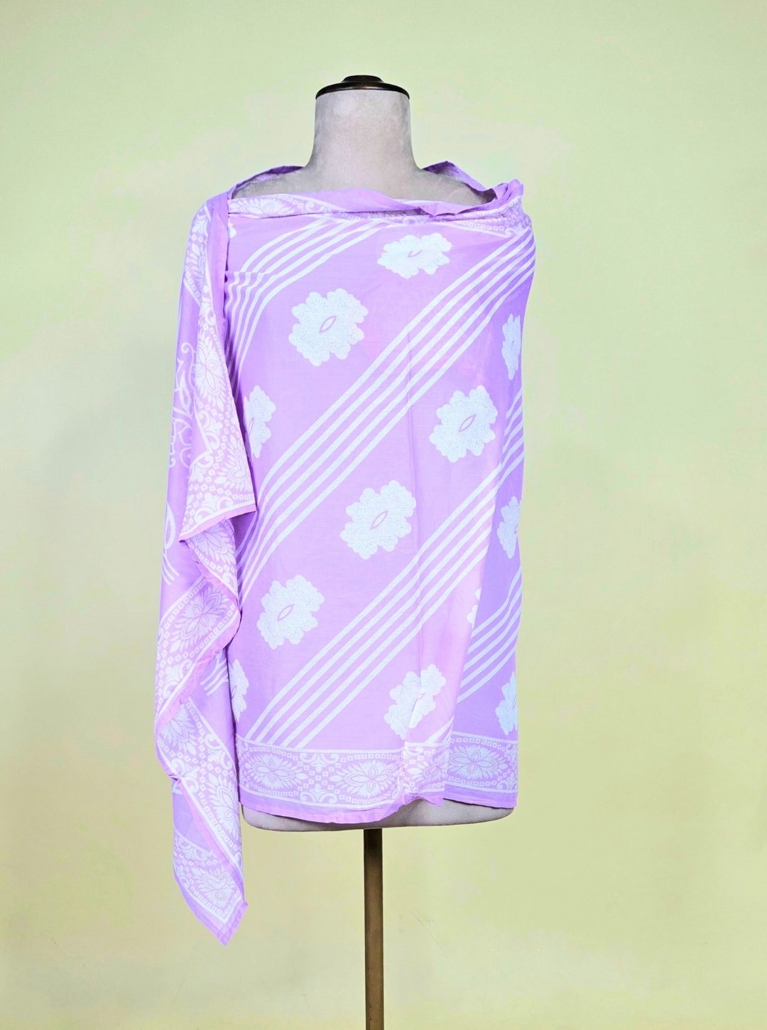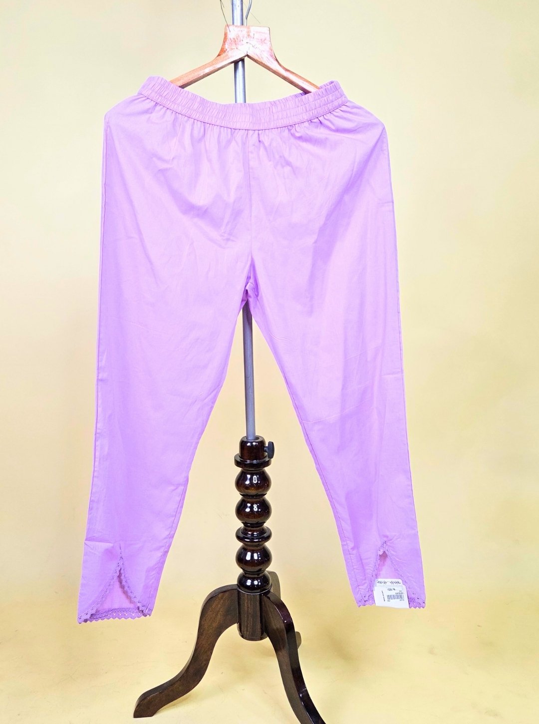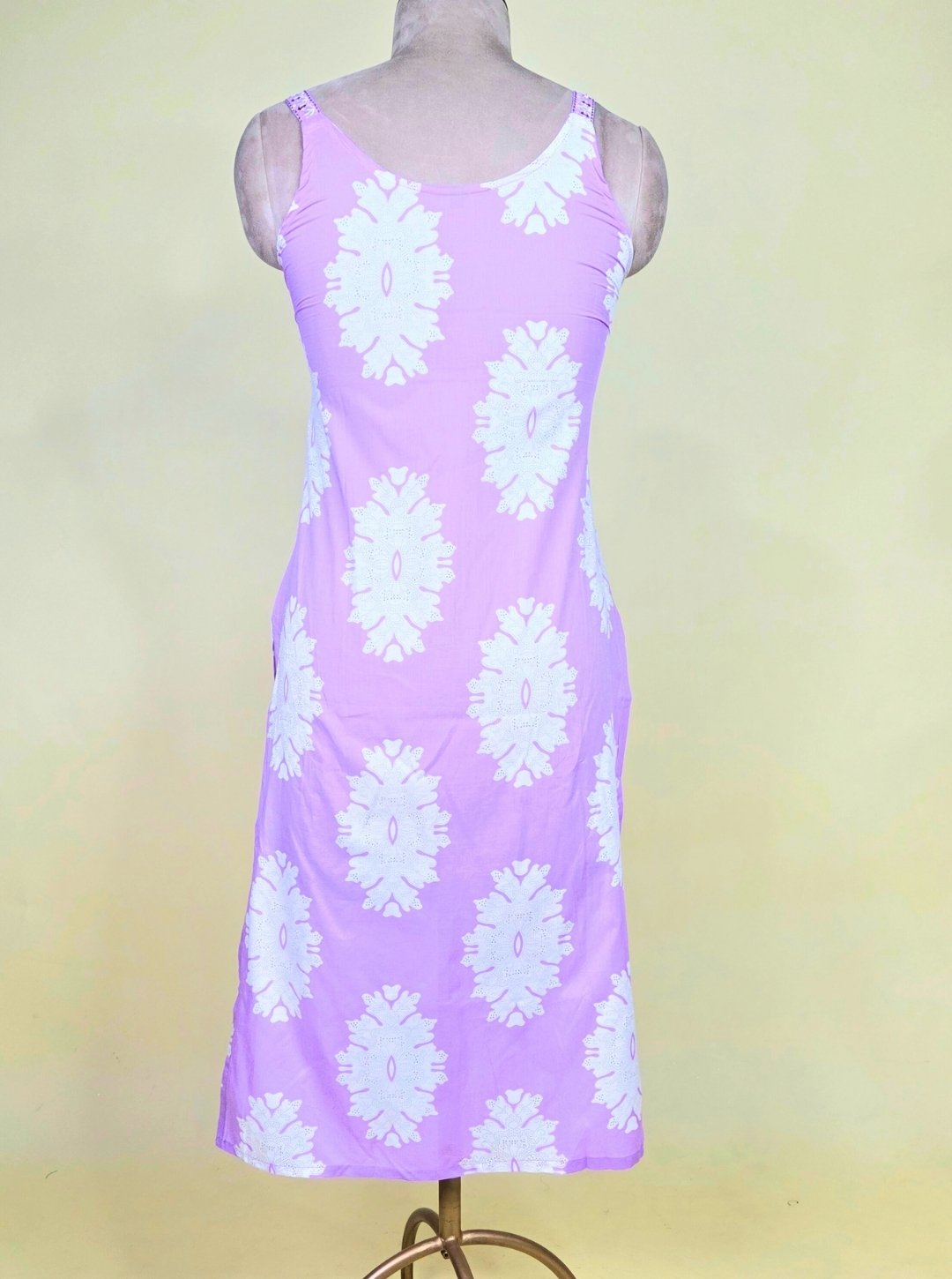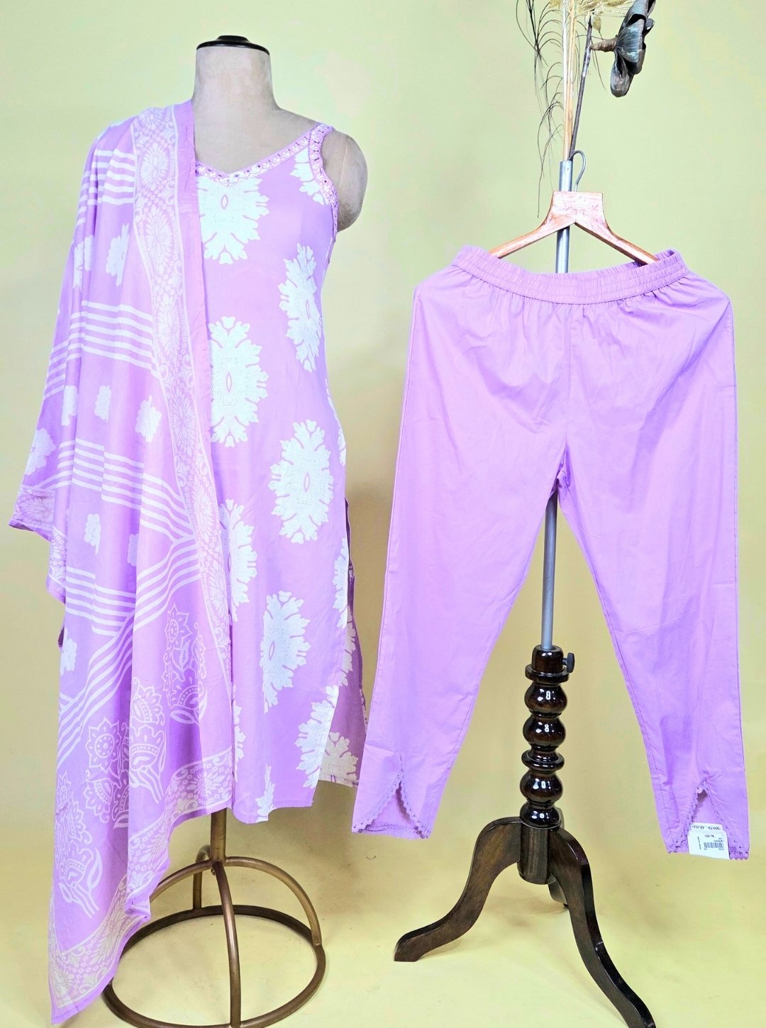- Kurti: Sleeveless cambric cotton kurti in a delightful lavender shade, featuring elegant resham thread work on the neckline and floral print detailing.