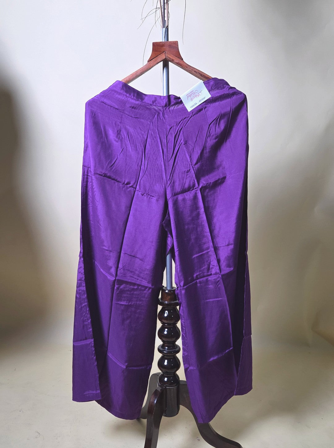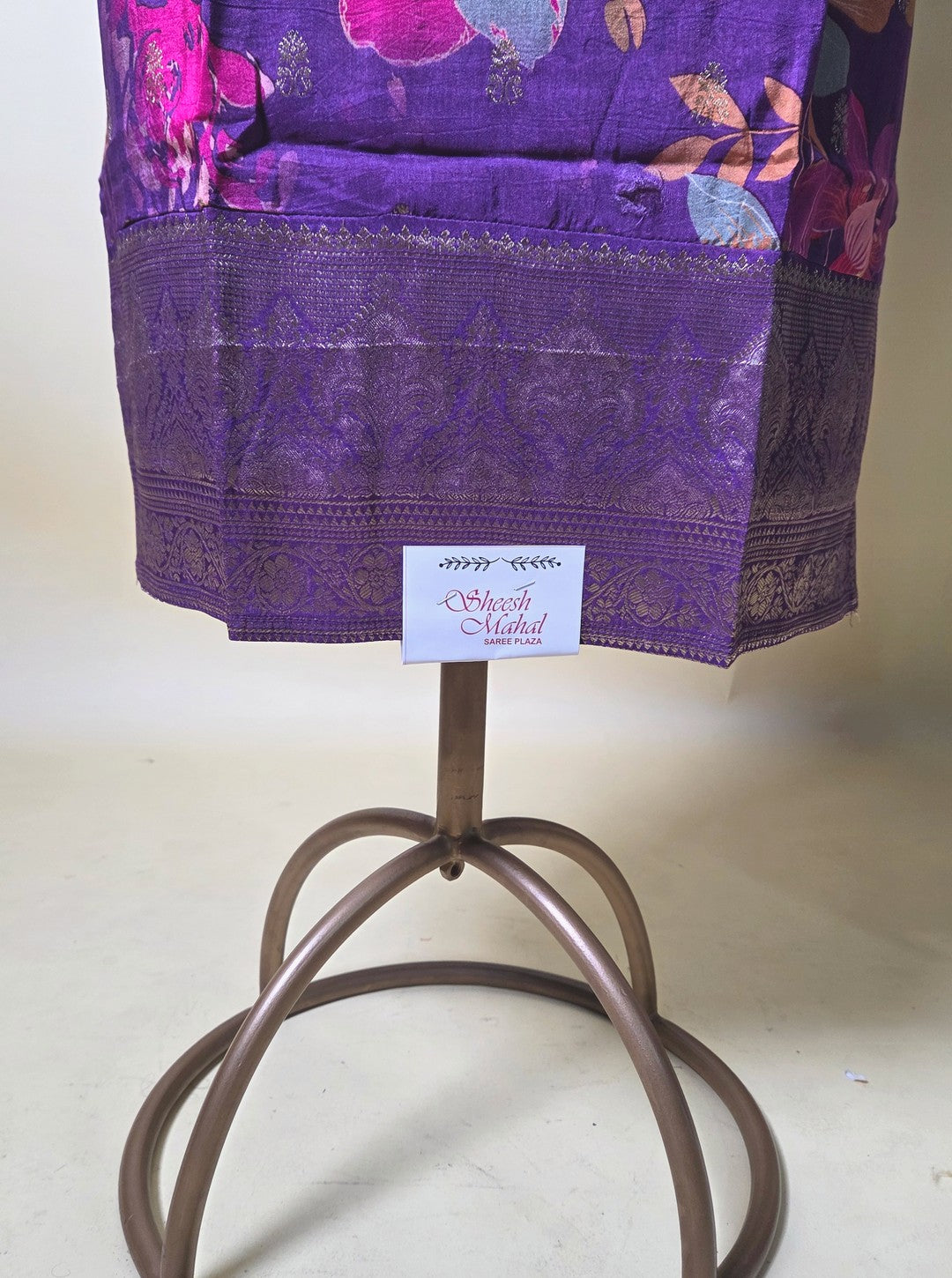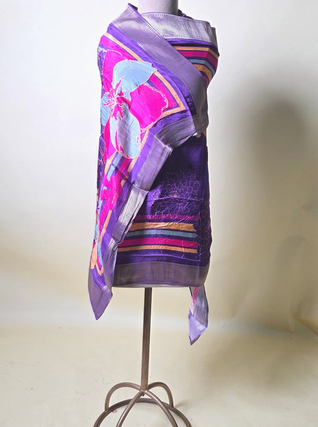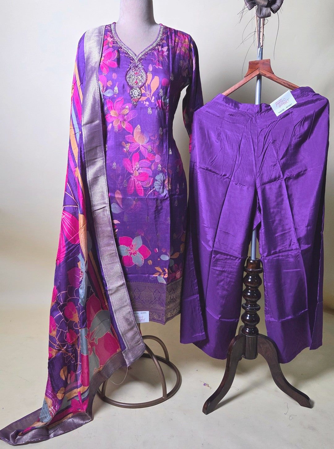 Elevate your ethnic wardrobe with this graceful Maslin silk suit set, soaked in royal purple and adorned with vibrant floral prints. The kurti features an exquisite embellished neckline with intricate bead and thread work that adds a touch of sparkle. The matching silk pants exude richness, while the digitally printed dupatta in multicolour floral motifs and zari border beautifully completes the look.
