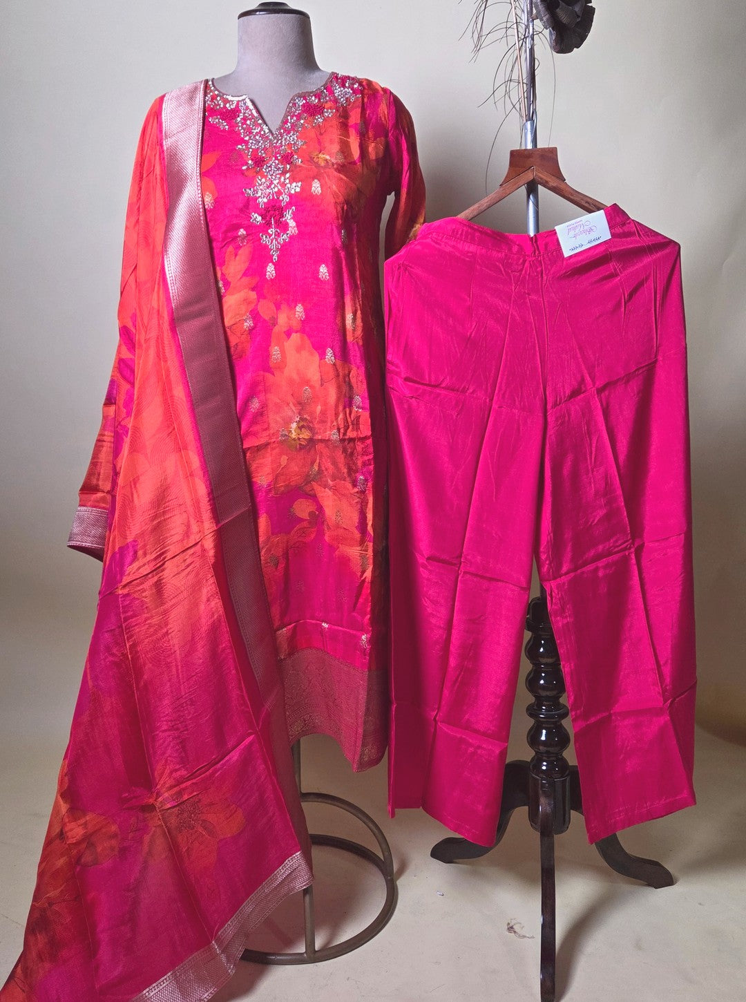 Drape yourself in vibrance with this stunning Maslin Silk Suit. Set in a rich fuchsia hue, designed to leave a lasting impression. The kurta showcases hand-embroidered neckline detailing with mirror and threadwork, paired with a vivid floral print that flows seamlessly. Complemented by a two-tone floral dupatta in shades of orange and pink with zari borders and solid matching silk pants, this ensemble radiates festive elegance.
