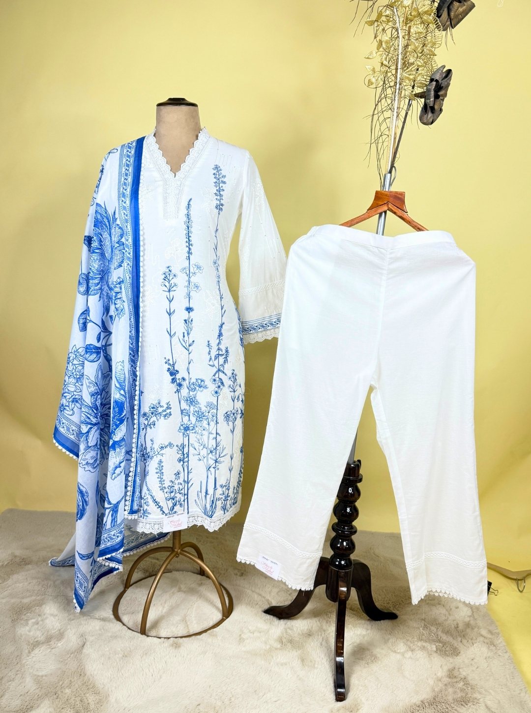 Graceful, breathable, and effortlessly elegant — this Mul Cotton Suit is your perfect summer ensemble. Crafted from soft mul cotton, the kurti features intricate resham embroidery paired with a delicate lace-trimmed neckline, elevating its feminine charm. Coordinated with a printed mul cotton dupatta and a solid cotton pant, this set ensures all-day comfort while making a style statement.