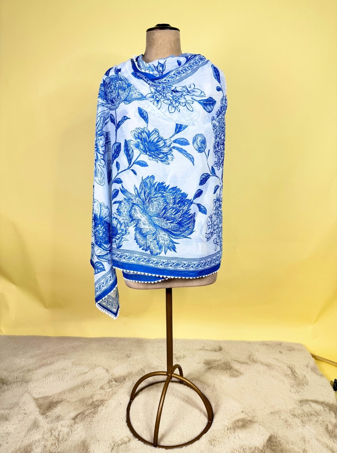 - Design Highlights: Blue floral prints, bell sleeves, lace border accents