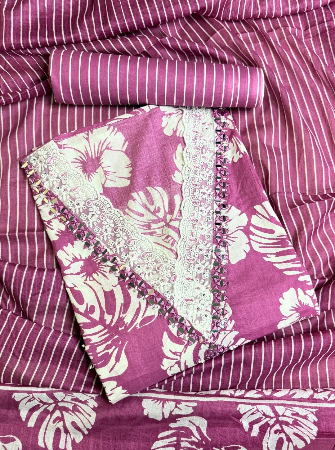 PINK COLOUR V-NECK WITH MIRROR WORK SUIT MULL COTTON DUPATTA STRIPE BOTTOM (SUIT1014)