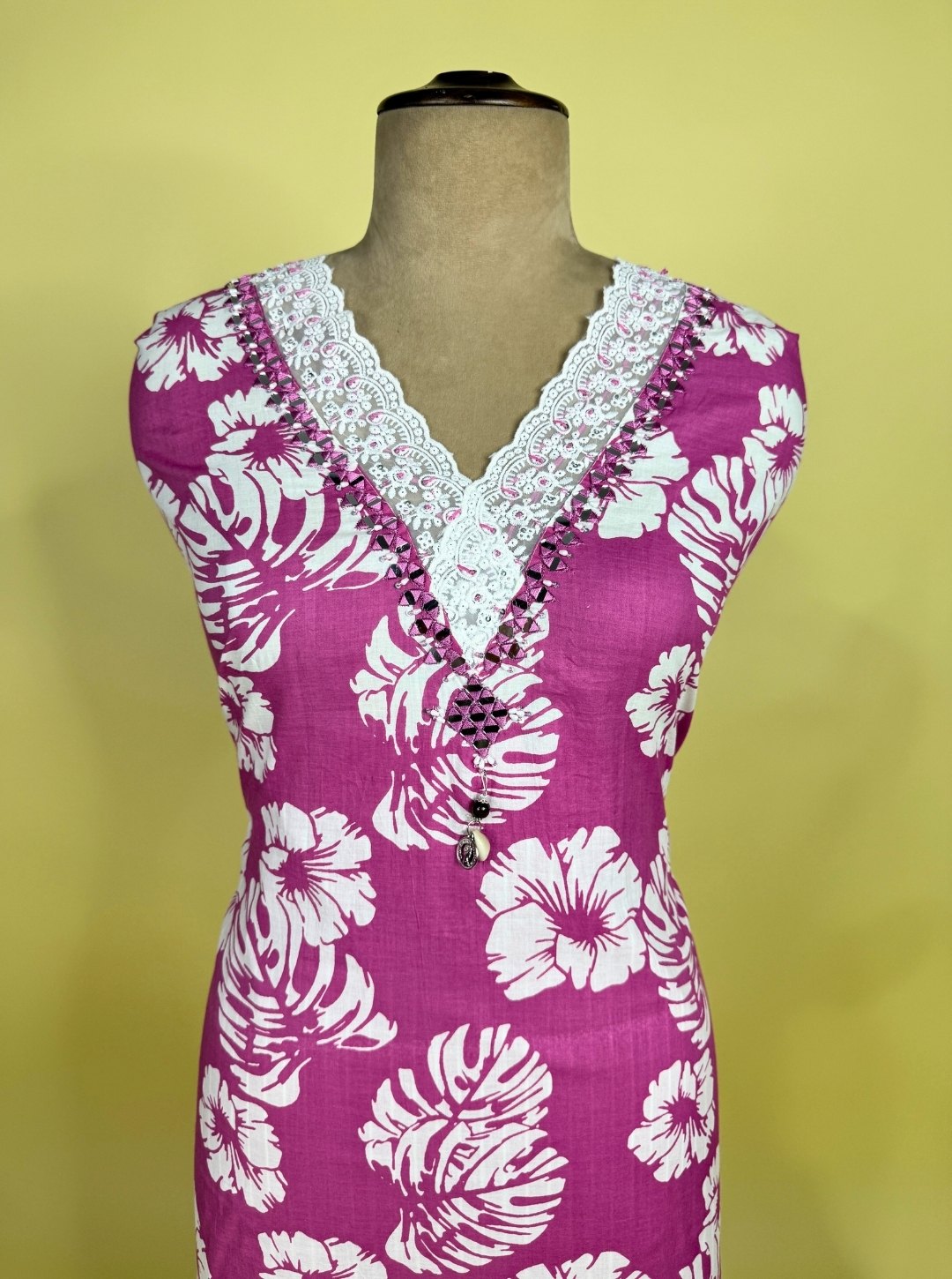 - A printed cotton kurta with floral white motifs, styled with a flattering V-neckline and subtle mirror work.