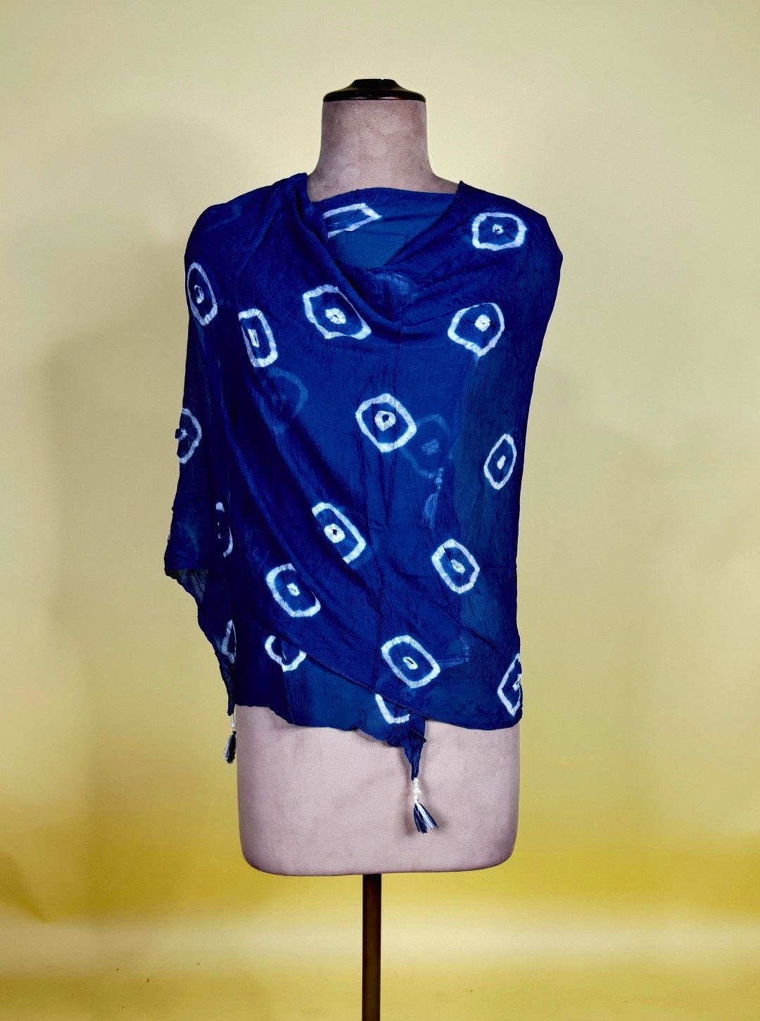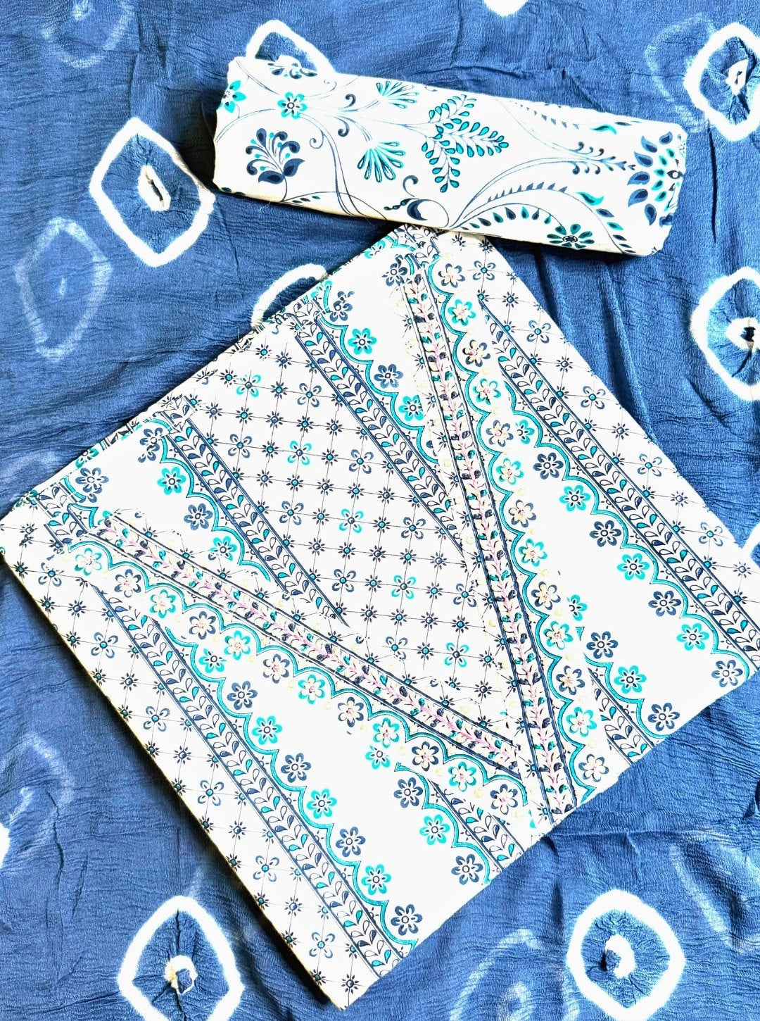 - A blue georgette dupatta with bandhani-style print, adding a flowy and festive touch to the set.