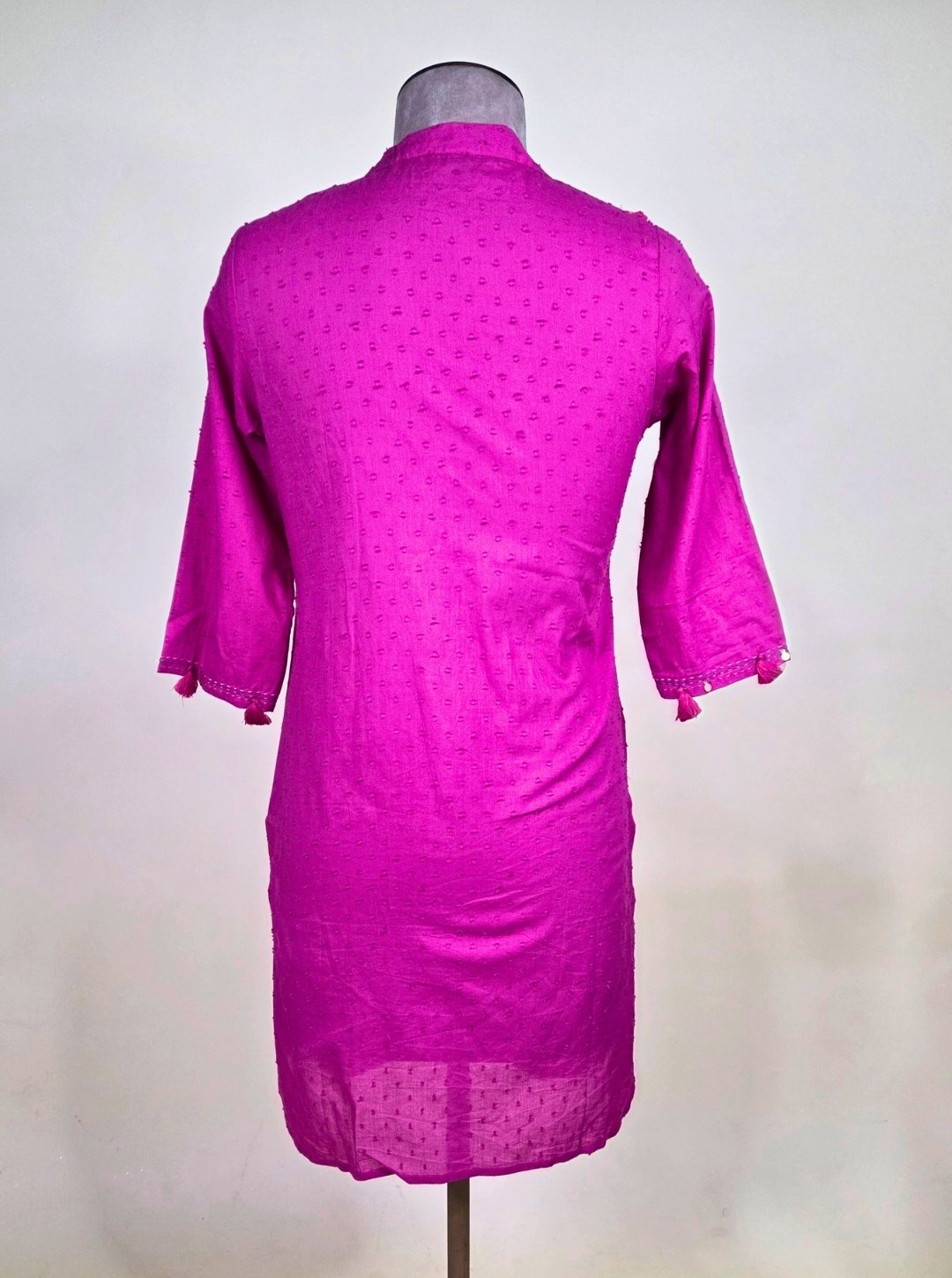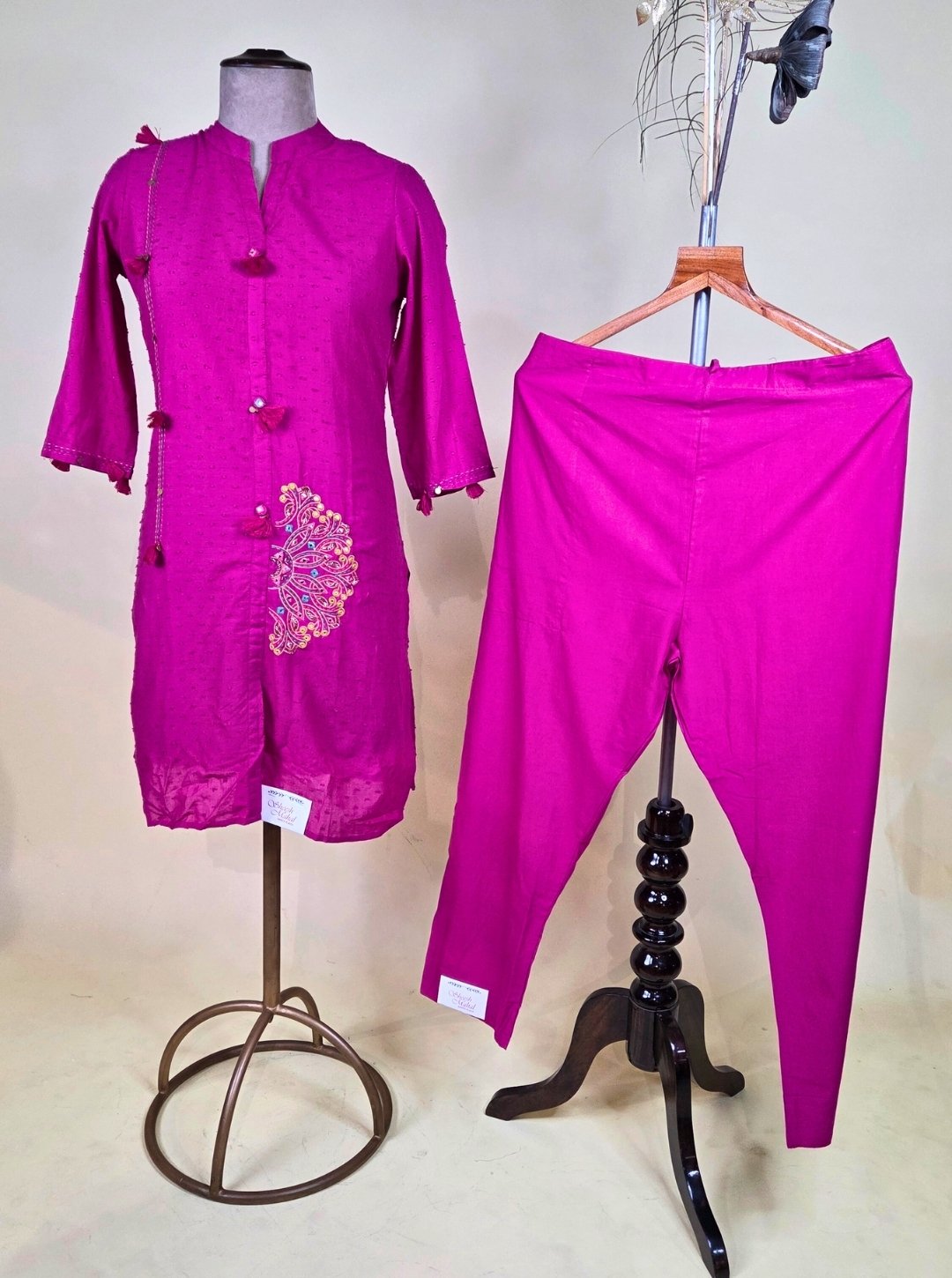 Brighten up your wardrobe with this vibrant rani pink cambric cotton kurti set, designed for both festive charm and everyday grace. Crafted from breathable fabric and adorned with intricate details, this two-piece outfit is a beautiful blend of comfort and style.
