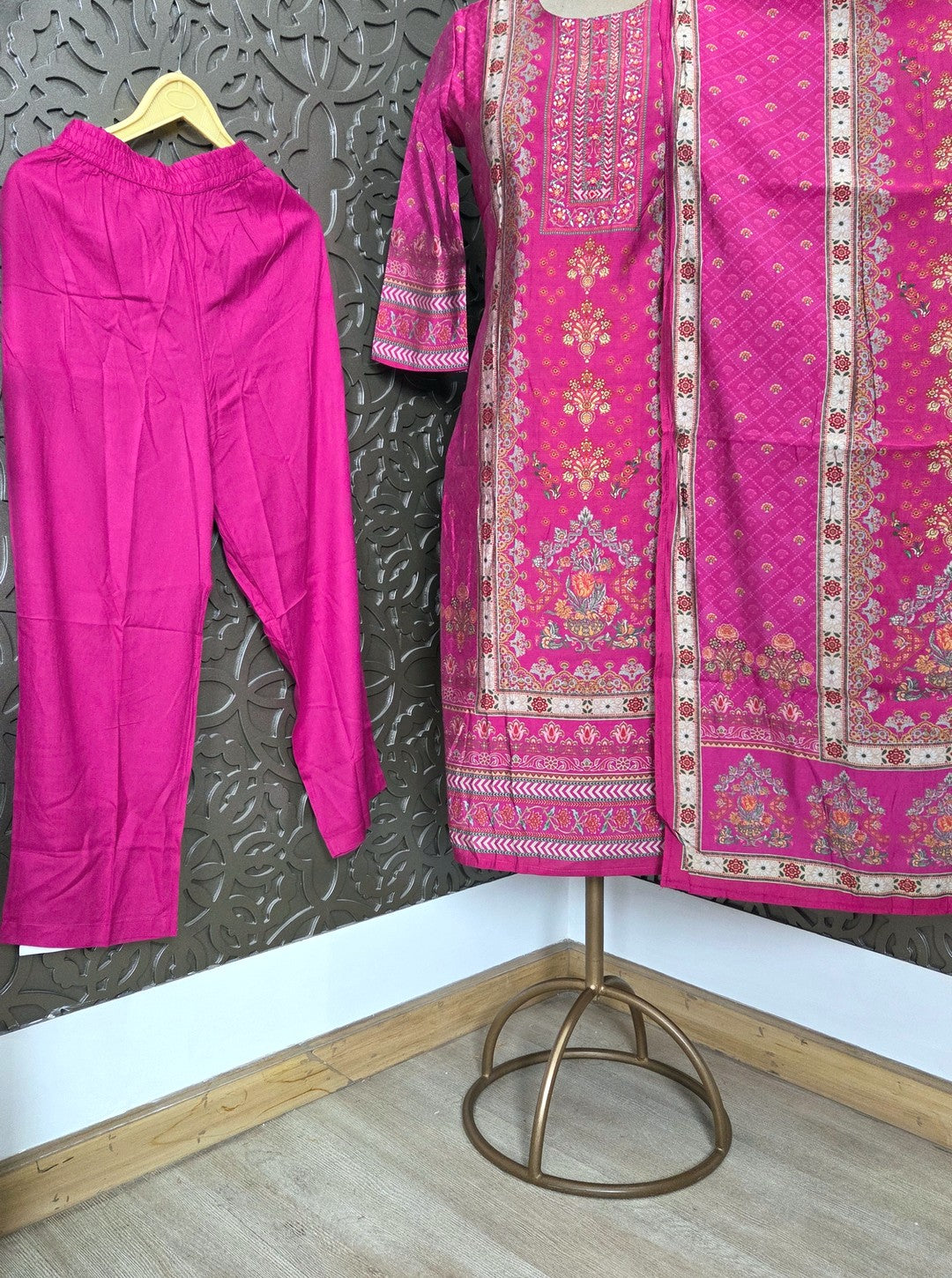 Discover comfort and style with this elegant Rayon Cotton Suit Set, paired with a beautifully designed digital print stall-style dupatta and matching pant. The breathable rayon fabric ensures day-long ease, while the bold digital print adds a touch of contemporary flair to traditional wear.