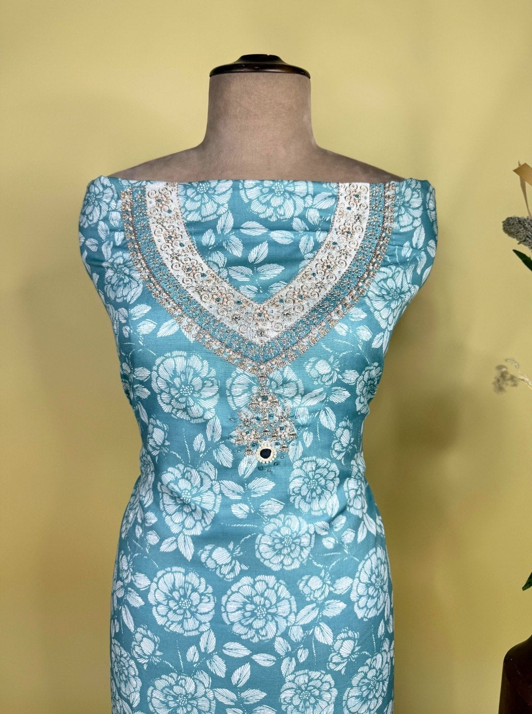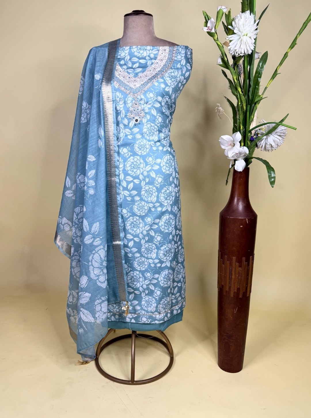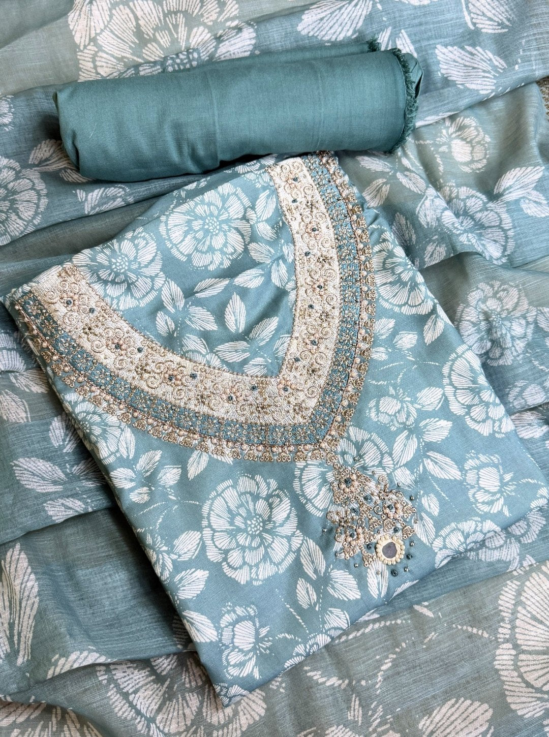 SEA GREEN COLOR JAAM COTTON WITH HAND RESHAM WORK LINEN DUPATTA ZARI BORDER (SUIT1013)
