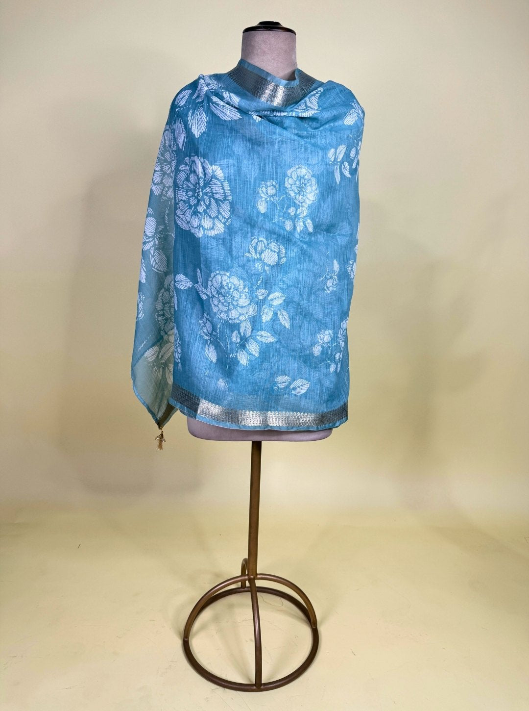 - A soft linen dupatta featuring elegant zari borders and floral prints for a graceful finish.