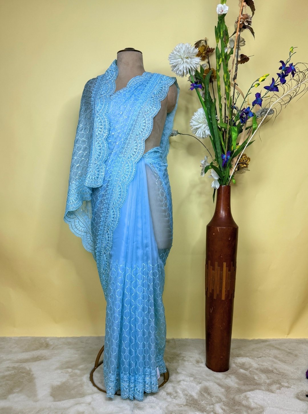 Embrace effortless elegance in this ethereal Sky Blue Organza Saree, adorned with delicate sequence work that catch the light with every step. The sheer, airy texture of organza paired with finely embroidered scalloped borders and all-over patterned embellishments creates a dreamy silhouette—perfect for festive soirées or elegant day events.