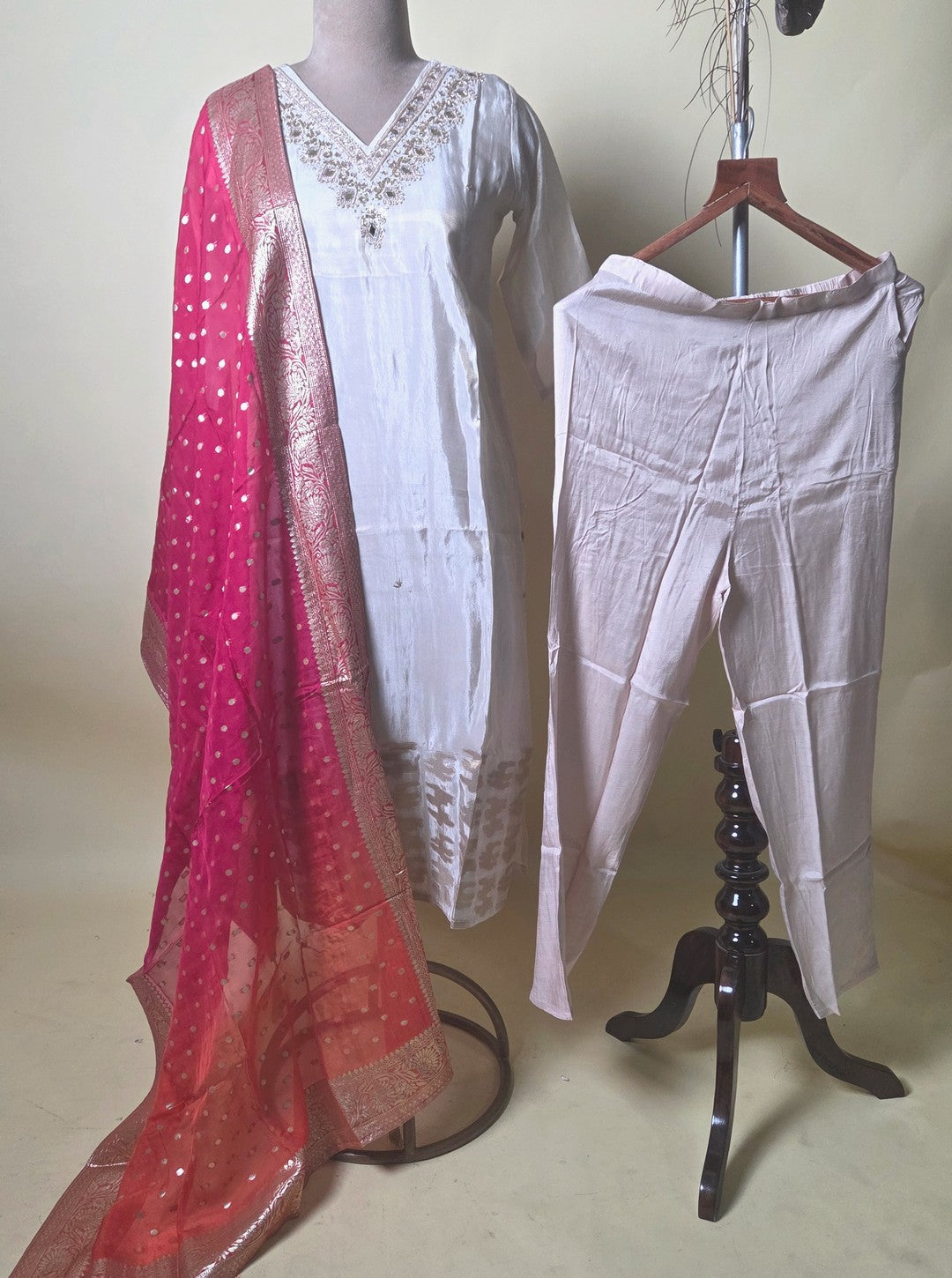 Grace your ethnic wardrobe with this timeless tissue organza kurti set, featuring a subtle shimmer and a touch of royalty. The pristine white kurti is adorned with delicate embroidery at the neckline, exuding effortless elegance. Paired with soft matching pants and a vibrant multishade Banarasi-style dupatta in fuchsia and coral tones with golden zari weave, this ensemble is perfect for festive occasions and intimate gatherings.