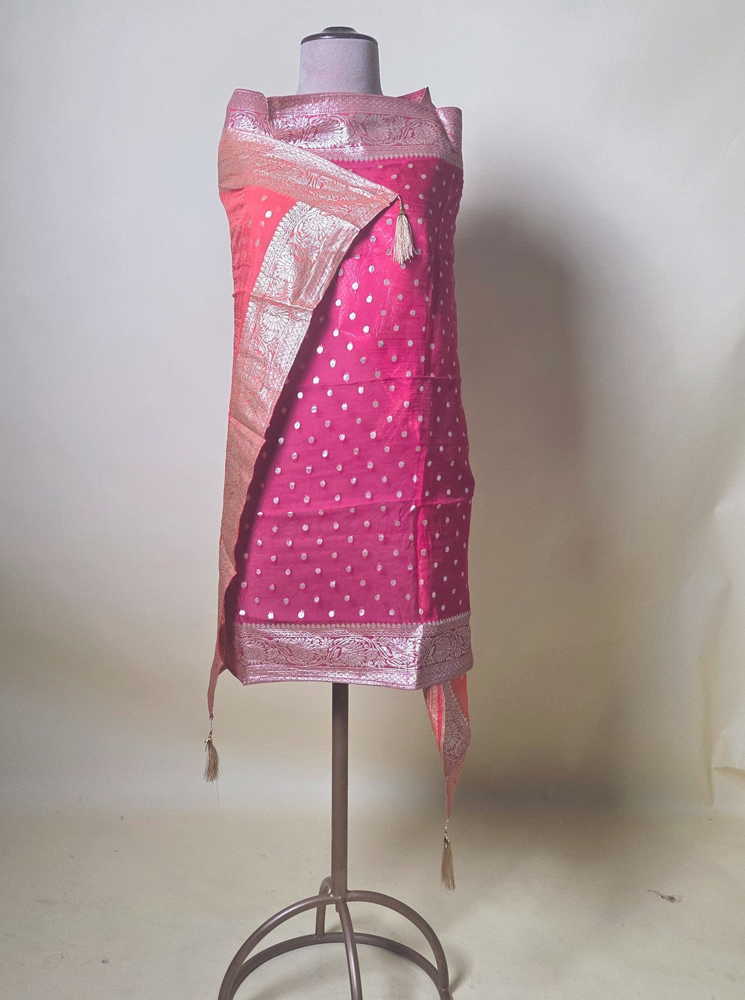 - Dupatta Highlights: Dual-tone pink & orange hues with golden buti and zari border