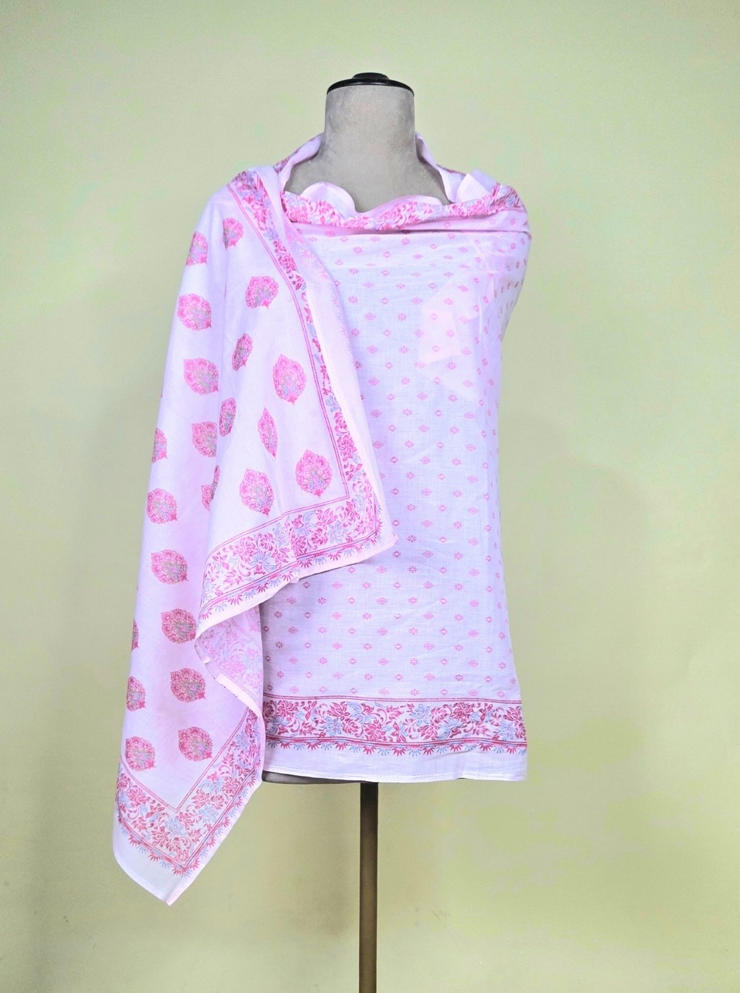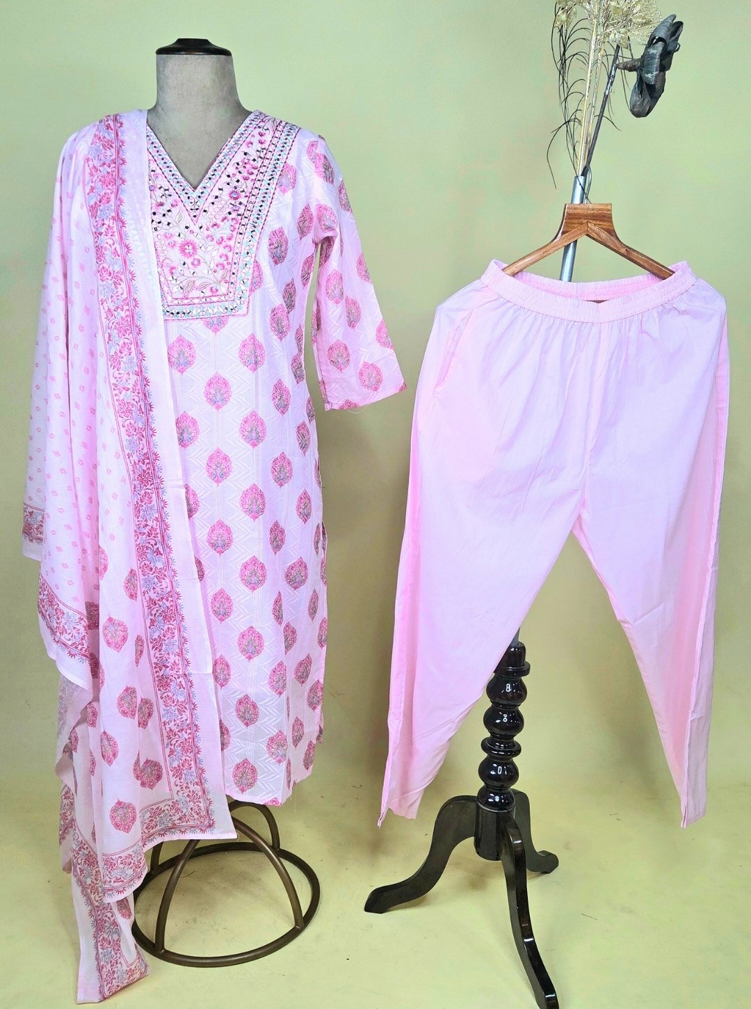 Grace your wardrobe with this soothing and stylish soft pink cotton kurti set, tailored for those who adore understated elegance. Featuring a charming V-neckline adorned with delicate resham embroidery, this kurti radiates ethnic finesse. The accompanying cotton printed pant and coordinated cotton dupatta make it a breezy, all-day comfort ensemble.