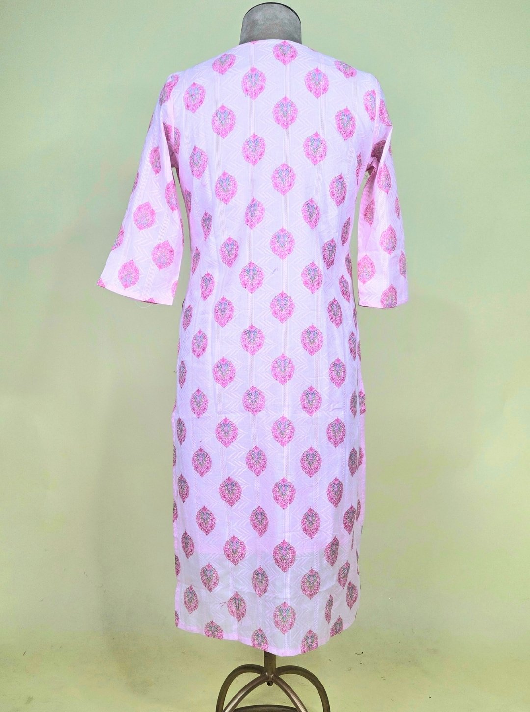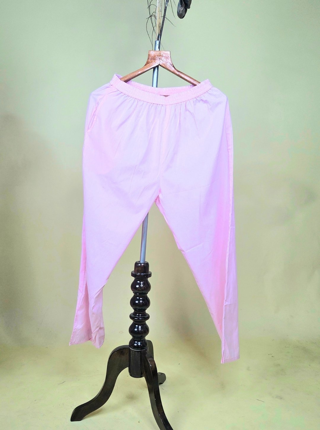 - Kurti: Soft pink hue, V-neck design with resham thread embroidery, and subtle printed detailing.