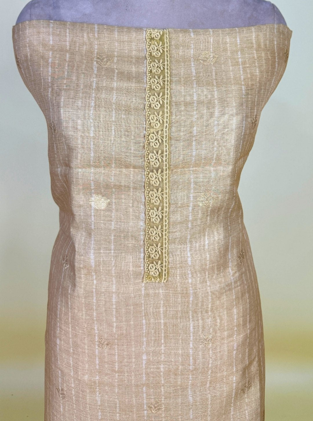 - A finely woven beige tissue linen kurta with light golden threadwork and a sleek embroidered neckline.